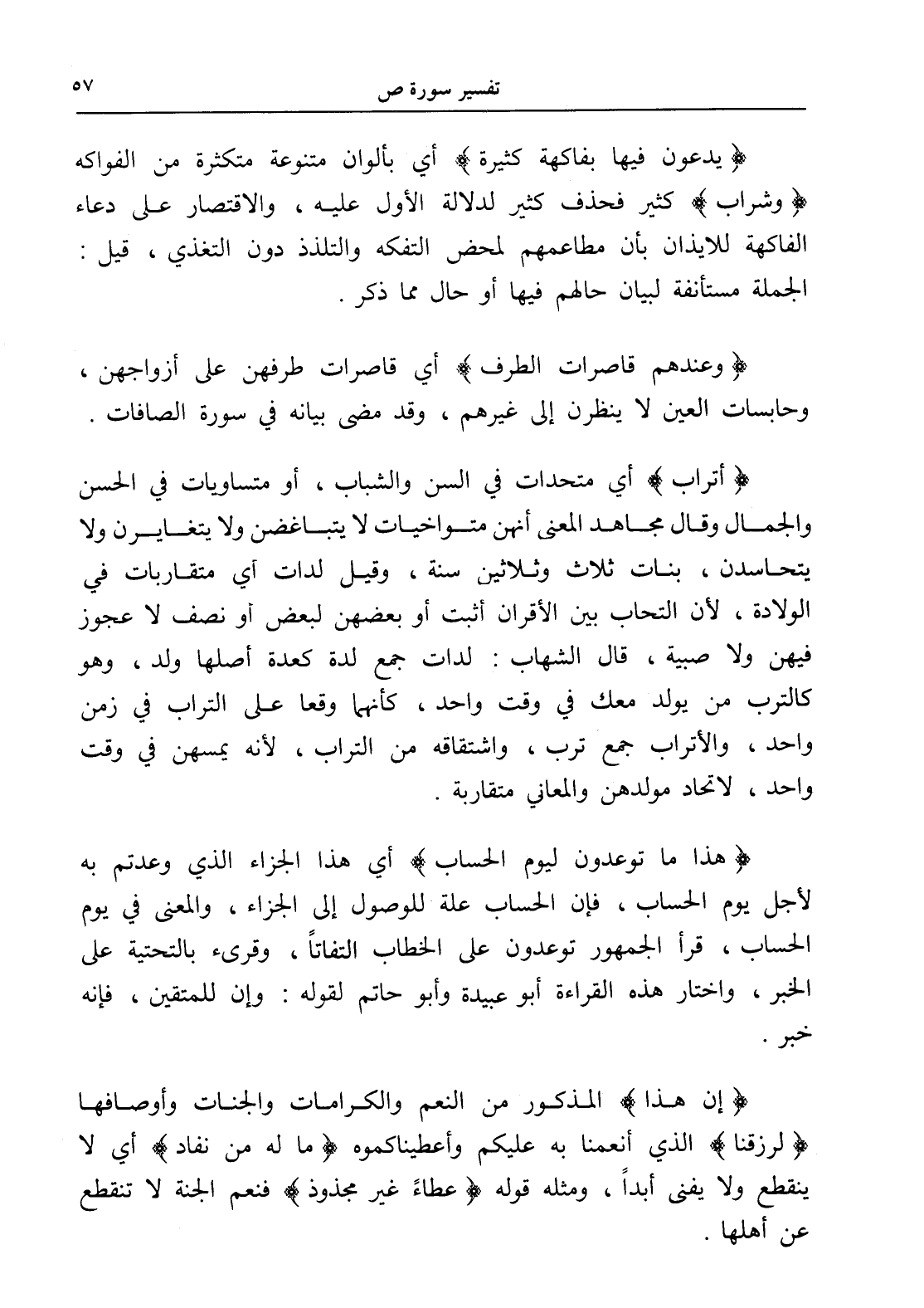 (أتراب) أي متحدات في السن والشباب، أو متساويات في الحسن والجمال وقال مجاهد المعنى أنهن متواخيات لا يتباغضن ولا يتغايرن ولا يتحاسدن، بنات ثلاث وثلاثين سنة، وقيل لدات آي متقاربات في الولادة، لأن التحاب بين الأقران أثبت أو بعضهن لبعض أو نصف لا عجوز فيهن ولا صبية، قال الشهاب: لدات جمع لدة كعدة أصلها ولد، وهو كالترب من يولد معك في وقت واحد، كأنهما وقعا على التراب في زمن واحد، والأتراب جمع ترب، واشتقاقه من التراب، لأنه يمسهن في وقت واحد، لاتحاد مولدهن والمعاني متقاربة.
