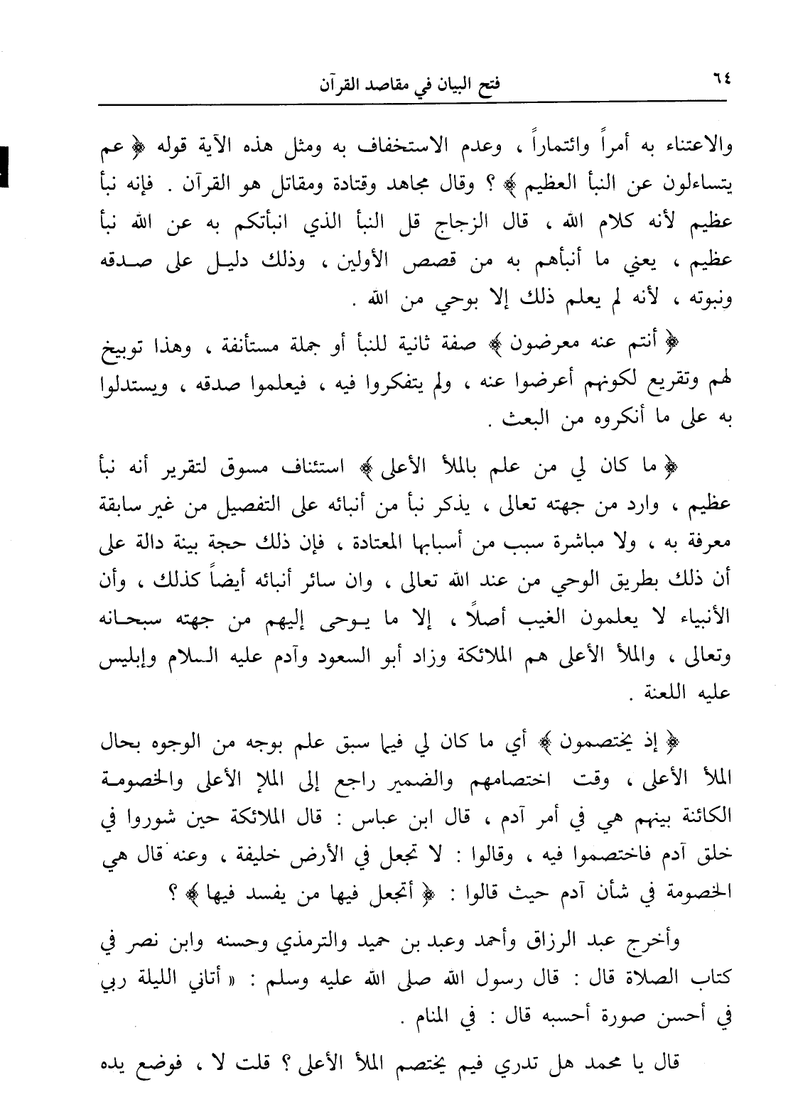 قال يا محمد هل تدري فيم يختصم الملأ الأعلى؟ قلت لا، فوضع يده