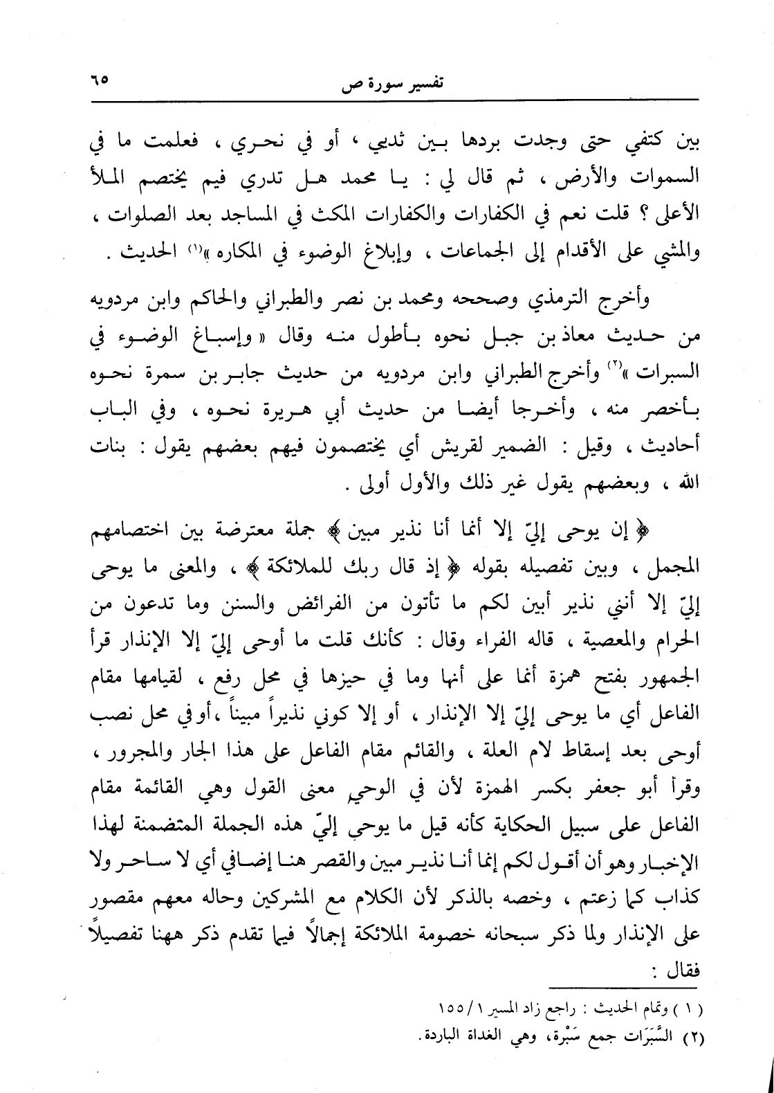 وأخرج الترمذي وصححه ومحمد بن نصر والطبراني والحاكم وابن مردويه من حديث معاذ بن جبل نحوه بأطول منه وقال " وإسباغ الوضوء في السبرات " (¬2) وأخرج الطبراني وابن مردويه من حديث جابر بن سمرة نحوه بأخصر منه، وأخرجا أيضاً من حديث أبي هريرة نحوه، وفي الباب أحاديث، وقيل: الضمير لقريش أي يختصمون فيهم بعضهم يقول: بنات الله، وبعضهم يقول غير ذلك والأول أولى.