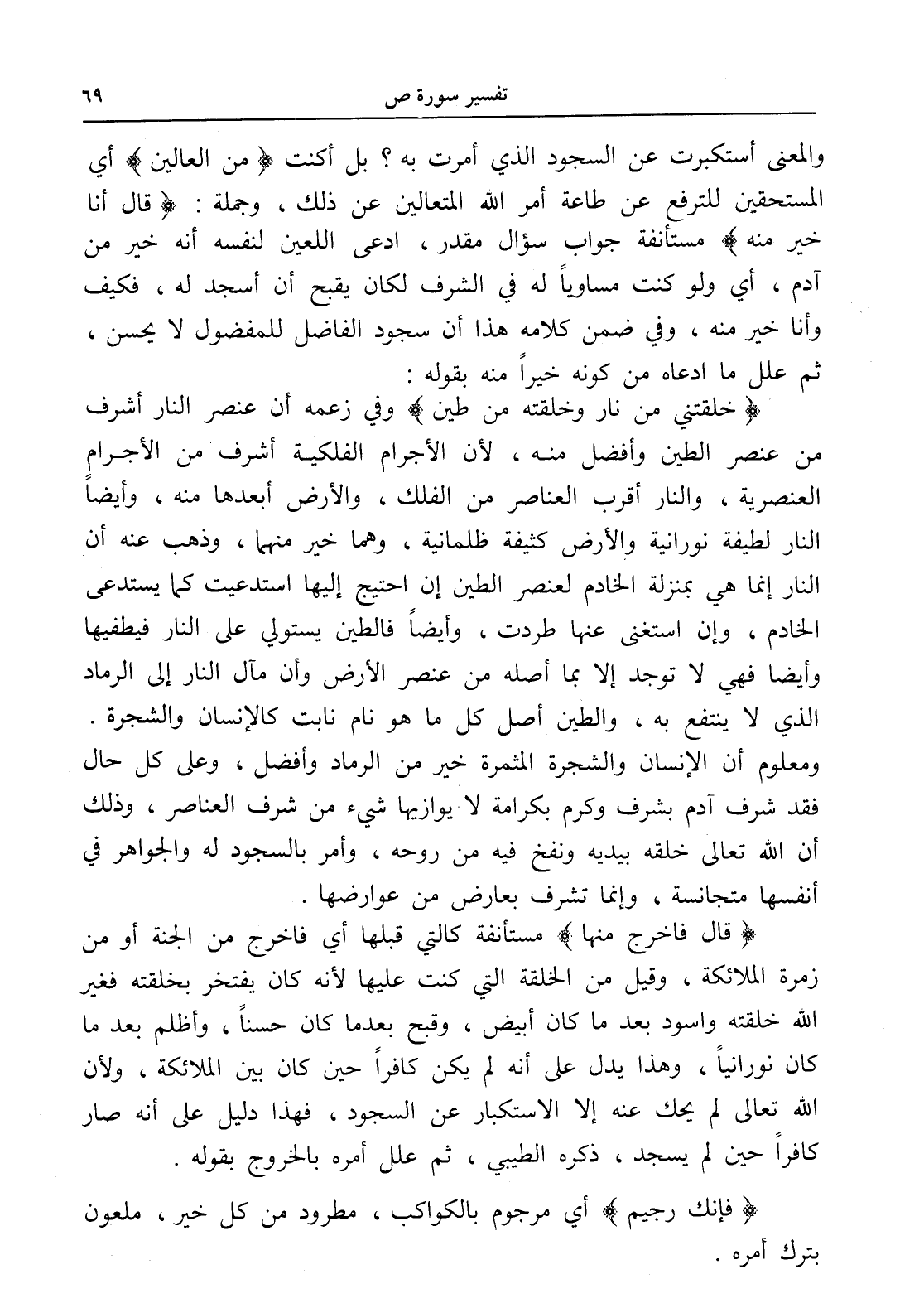 (خلقتني من نار وخلقته من طين) وفي زعمه أن عنصر النار أشرف من عنصر الطين وأفضل منه، لأن الأجرام الفلكية أشرف من الأجرام العنصرية، والنار أقرب العناصر من الفلك، والأرض أبعدها منه، وأيضاً النار لطيفة نورانية والأرض كثيفة ظلمانية، وهما خير منهما، وذهب عنه أن النار إنما هي بمنزلة الخادم لعنصر الطين إن احتيج إليها استدعيت كما يستدعى الخادم، وإن استغنى عنها طردت، وأيضاًً فالطين يستولي على النار فيطفيها وأيضاً فهي لا توجد إلا بما أصله من عنصر الأرض وأن مآل النار إلى الرماد الذي لا ينتفع به، والطين أصل كل ما هو نام نابت كالإنسان والشجرة.