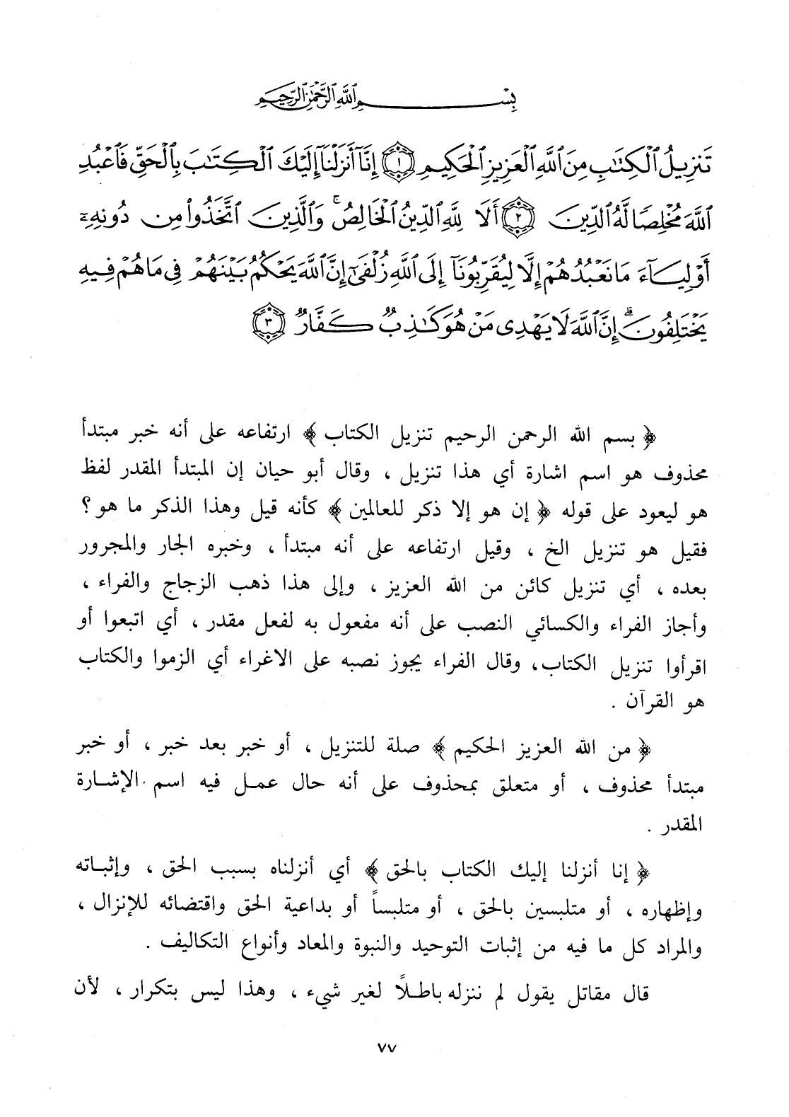 تَنْزِيلُ الْكِتَابِ مِنَ اللَّهِ الْعَزِيزِ الْحَكِيمِ (1) إِنَّا أَنْزَلْنَا إِلَيْكَ الْكِتَابَ بِالْحَقِّ فَاعْبُدِ اللَّهَ مُخْلِصًا لَهُ الدِّينَ (2) أَلَا لِلَّهِ الدِّينُ الْخَالِصُ وَالَّذِينَ اتَّخَذُوا مِنْ دُونِهِ أَوْلِيَاءَ مَا نَعْبُدُهُمْ إِلَّا لِيُقَرِّبُونَا إِلَى اللَّهِ زُلْفَى إِنَّ اللَّهَ يَحْكُمُ بَيْنَهُمْ فِي مَا هُمْ فِيهِ يَخْتَلِفُونَ إِنَّ اللَّهَ لَا يَهْدِي مَنْ هُوَ كَاذِبٌ كَفَّارٌ (3)