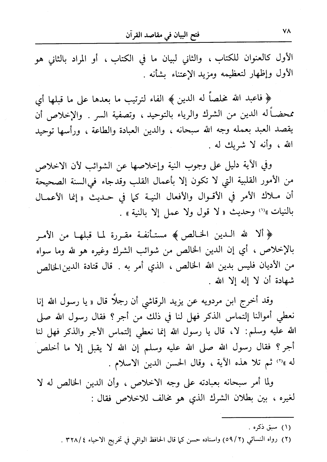 وفي الآية دليل على وجوب النية وإخلاصها عن الشوائب لأن الإخلاص من الأمور القلبية التي لا تكون إلا بأعمال القلب وقد جاء في السنة الصحيحة أن ملاك الأمر في الأقوال والأفعال النية كما في حديث " إنما الأعمال بالنيات " (¬1) وحديث " لا قول ولا عمل إلا بالنية ".