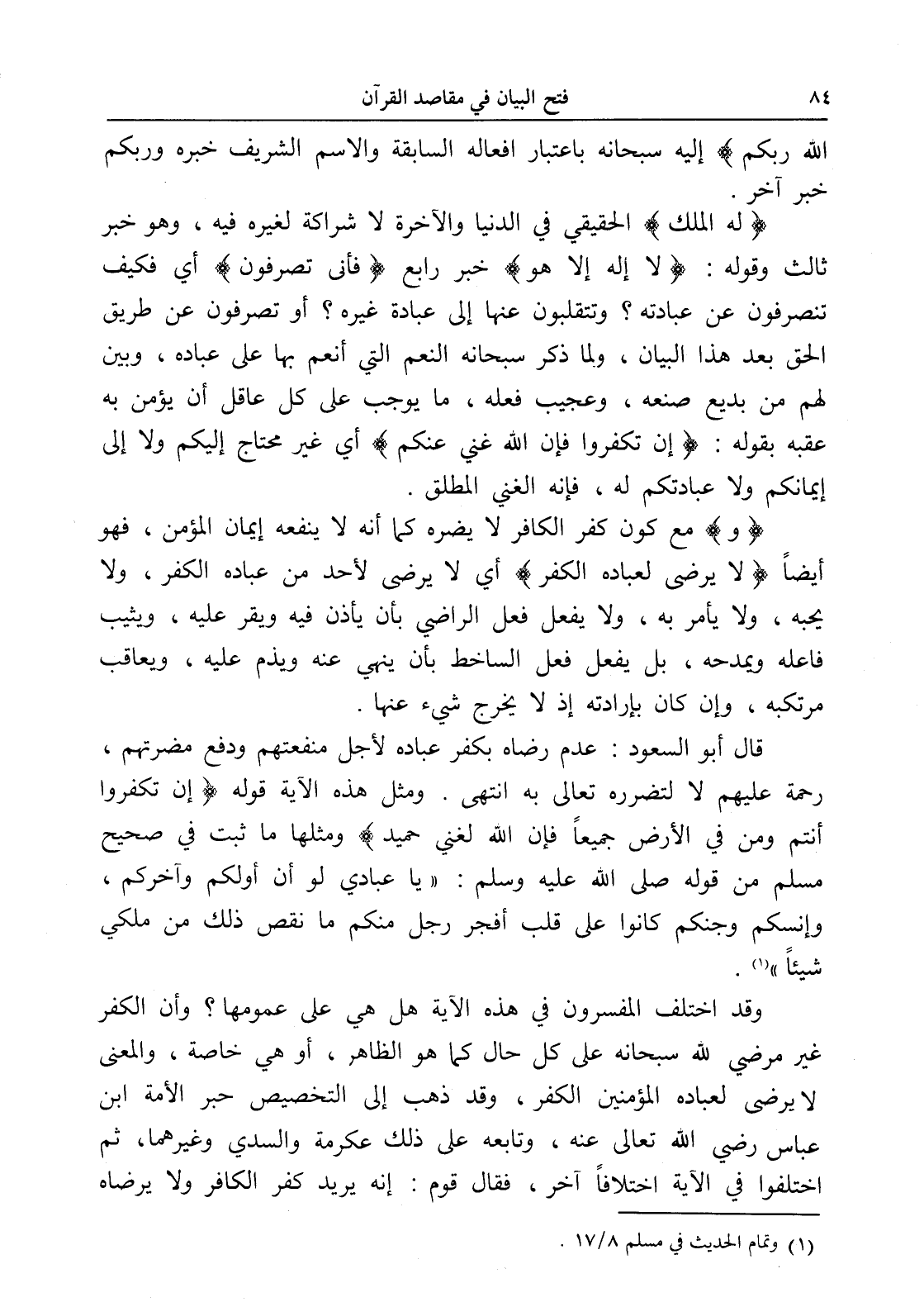 قال أبو السعود: عدم رضاه بكفر عباده لأجل منفعتهم ودفع مضرتهم، رحمة عليهم لا لتضرره تعالى به انتهى. ومثل هذه الآية قوله (إن تكفروا أنتم ومن في الأرض جميعاً فإن الله لغني حميد) ومثلها ما ثبت في صحيح مسلم من قوله صلى الله عليه وسلم: " يا عبادي لو أن أولكم وآخركم، وإنسكم وجنكم كانوا على قلب أفجر رجل منكم ما نقص ذلك من ملكي شيئاًً " (¬1).