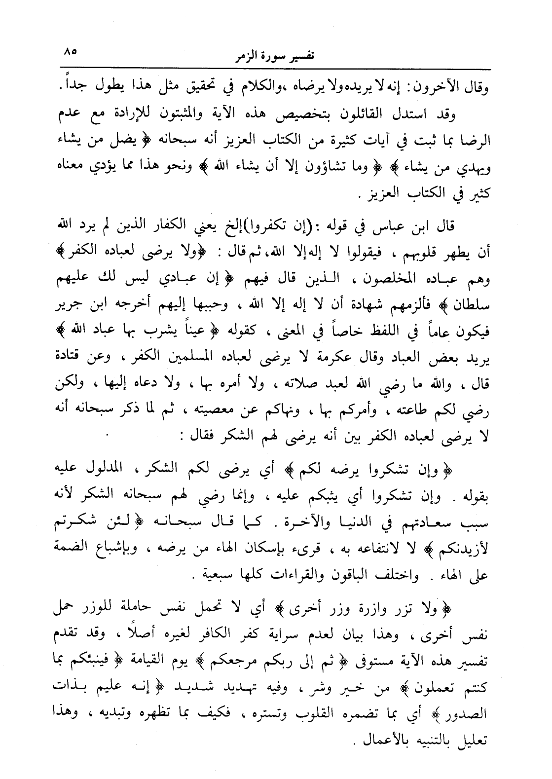 قال ابن عباس في قوله: (إن تكفروا) إلخ يعني الكفار الذين لم يرد الله أن يطهر قلوبهم، فيقولوا لا إله إلا الله، ثم قال: (ولا يرضى لعباده الكفر) وهم عباده المخلصون، الذين قال فيهم (إن عبادي ليس لك عليهم سلطان) فألزمهم شهادة أن لا إله إلا الله، وحببها إليهم أخرجه ابن جرير فيكون عاماً في اللفظ خاصاً في المعنى، كقوله (عيناً يشرب بها عباد الله) يريد بعض العباد وقال عكرمة لا يرضى لعباده المسلمين الكفر، وعن قتادة قال، والله ما رضي الله لعبد صلاته، ولا أمره بها، ولا دعاه إليها، ولكن رضي لكم طاعته، وأمركم بها، ونهاكم عن معصيته، ثم لما ذكر سبحانه أنه لا يرضى لعباده الكفر بين أنه يرضى لهم الشكر فقال: