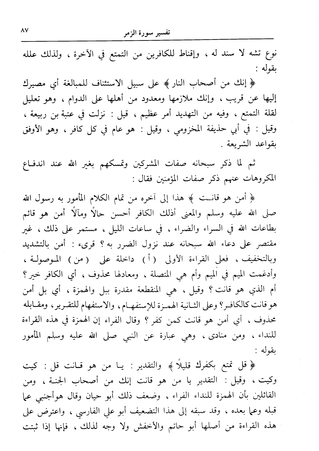 (قل تمتع بكفرك قليلاً) والتقدير: يا من هو قانت قل: كيت وكيت، وقيل: التقدير يا من هو قانت إنك من أصحاب الجنة، ومن القائلين بأن الهمزة للنداء الفراء، وضعف ذلك أبو حيان وقال هو أجنبي عما قبله وعما بعده، وقد سبقه إلا هذا التضعيف أبو علي الفارسي، واعترض على هذه القراءة من أصلها أبو حاتم والأخفش ولا وجه لذلك، فإنها إذا ثبتت