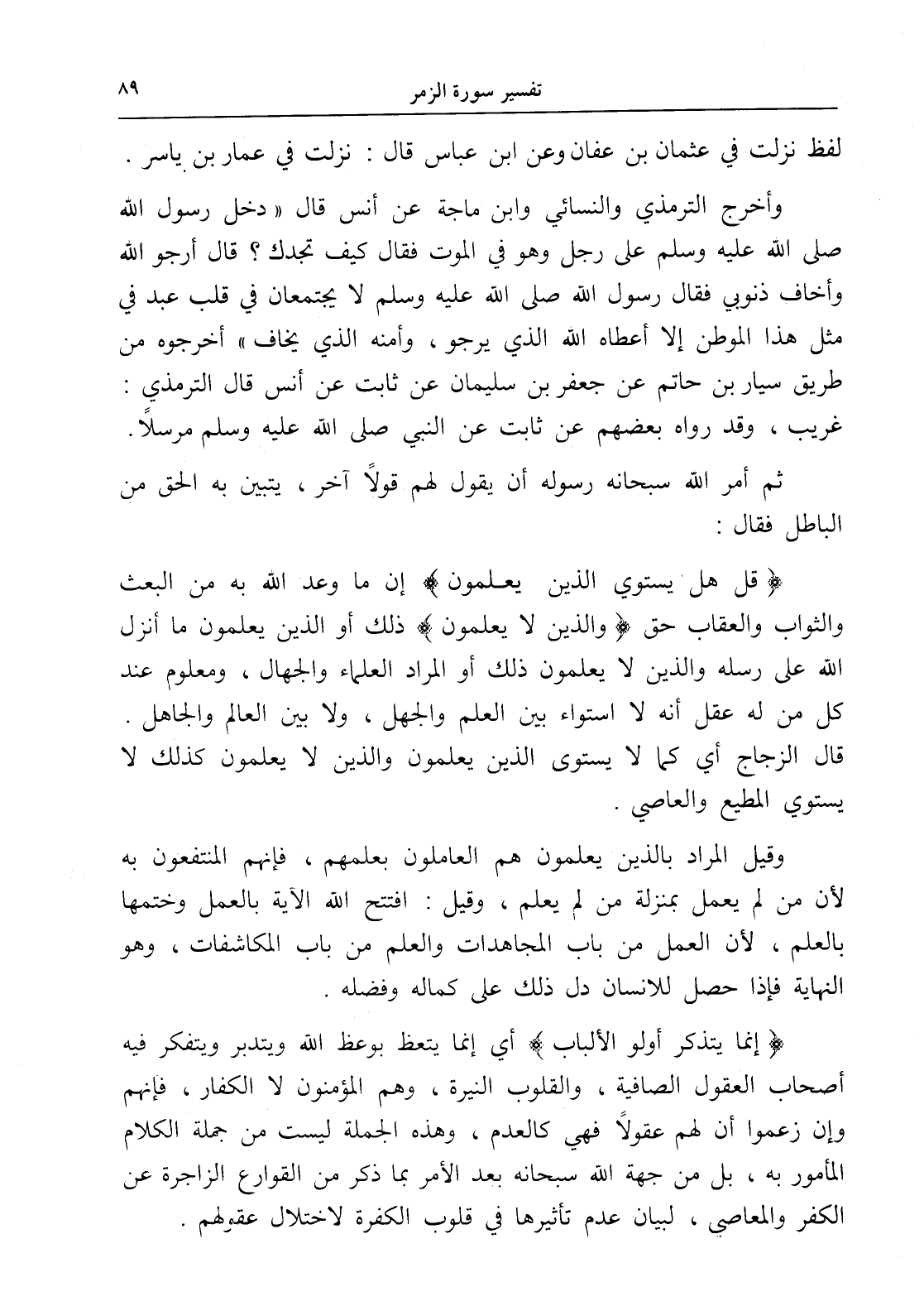 (قل هل يستوي الذين يعلمون) إن ما وعد الله به من البعث والثواب والعقاب حق (والذين لا يعلمون) ذلك أو الذين يعلمون ما أنزل الله على رسله والذين لا يعلمون ذلك أو المراد العلماء والجهال، ومعلوم عند كل من له عقل أنه لا استواء بين العلم والجهل، ولا بين العالم والجاهل.