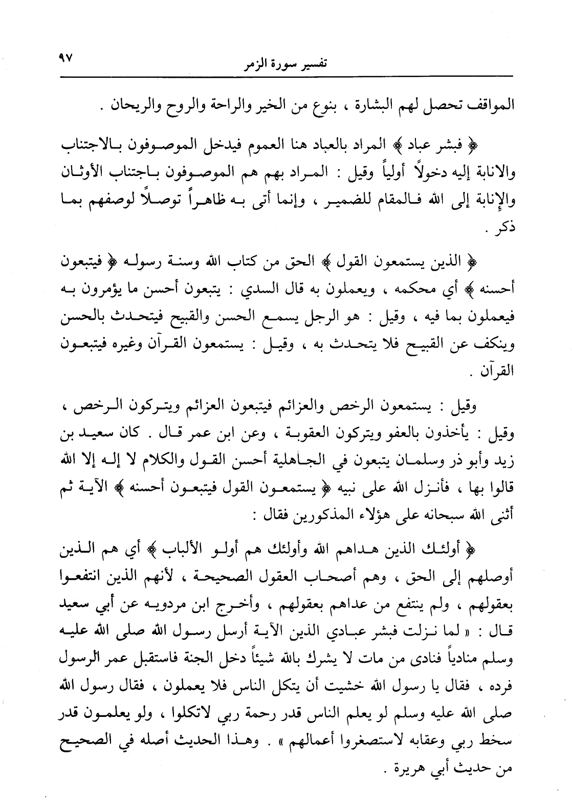 (أولئك الذين هداهم الله وأولئك هم أولو الألباب) أي هم الذين أوصلهم إلى الحق، وهم أصحاب العقول الصحيحة، لأنهم الذين انتفعوا بعقولهم، ولم ينتفع من عداهم بعقولهم، وأخرج ابن مردويه عن أبي سعيد قال: " لما نزلت فبشر عبادي الذين الآية أرسل رسول الله صلى الله عليه وسلم منادياً فنادى من مات لا يشرك بالله شيئاًً دخل الجنة فاستقبل عمر الرسول فرده، فقال يا رسول الله خشيت أن يتكل الناس فلا يعملون، فقال رسول الله صلى الله عليه وسلم لو يعلم الناس قدر رحمة ربي لاتكلوا، ولو يعلمون قدر سخط ربي وعقابه لاستصغروا أعمالهم ". وهذا الحديث أصله في الصحيح من حديث أبي هريرة.