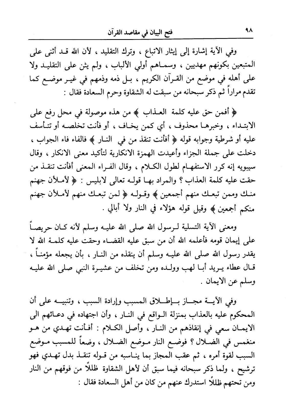 وفي الآية إشارة إلى إيثار الاتباع، وترك التقليد، لأن الله قد أثنى على المتبعين بكونهم مهديين، وسماهم أولي الألباب، ولم يثن على التقليد ولا على أهله في موضع من القرآن الكريم، بل ذمه وذمهم في غير موضع كما تقدم مراراً ثم ذكر سبحانه من سبقت له الشقاوة وحرم السعادة فقال: