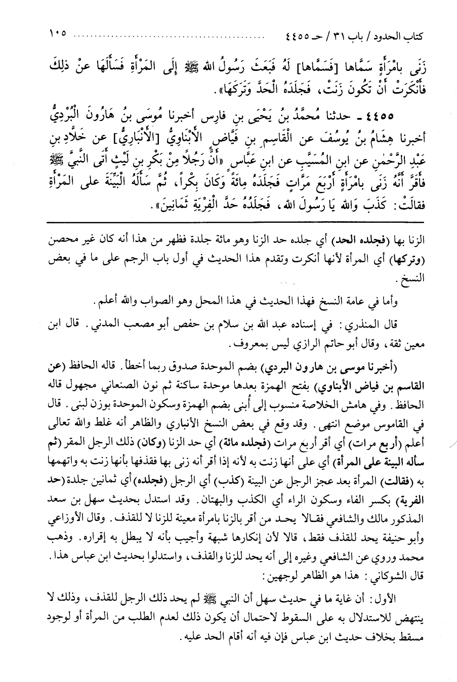 قَالَ الشَّوْكَانِيُّ هَذَا هُوَ الظَّاهِرُ لِوَجْهَيْنِ الْأَوَّلُ أَنَّ غَايَةَ مَا فِي حَدِيثِ سَهْلٍ أَنَّ النَّبِيَّ صَلَّى اللَّهُ عَلَيْهِ وَسَلَّمَ لَمْ يَحُدَّ ذَلِكَ الرَّجُلَ لِلْقَذْفِ وَذَلِكَ لَا يَنْتَهِضُ لِلِاسْتِدْلَالِ بِهِ عَلَى السُّقُوطِ لِاحْتِمَالِ أَنْ يَكُونَ ذَلِكَ لِعَدَمِ الطَّلَبِ مِنَ الْمَرْأَةِ أَوْ لوجود مسقط بخلاف حديث بن عَبَّاسٍ فَإِنَّ فِيهِ أَنَّهُ أَقَامَ الْحَدَّ عَلَيْهِ
