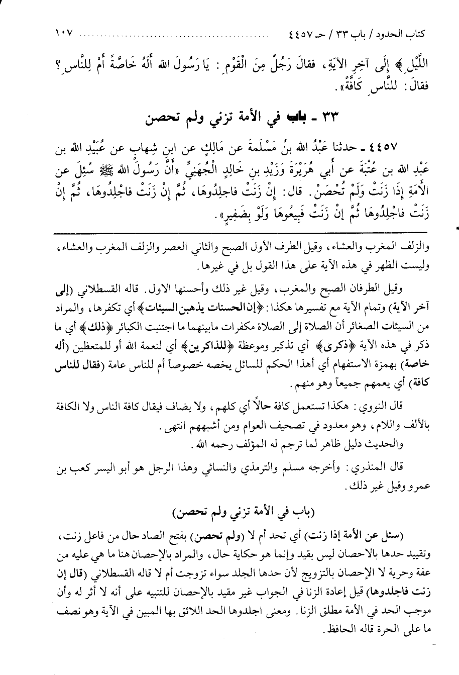 [4469] (سُئِلَ عَنِ الْأَمَةِ إِذَا زَنَتْ) أَيْ تُحَدُّ أَمْ لَا (وَلَمْ تُحْصَنْ) بِفَتْحِ الصَّادِ حَالٌ مِنْ فَاعِلِ زَنَتْ وَتَقْيِيدُ حَدِّهَا بِالْإِحْصَانِ لَيْسَ بِقَيْدٍ وَإِنَّمَا هُوَ حِكَايَةُ حَالٍ وَالْمُرَادُ بِالْإِحْصَانِ هُنَا مَا هِيَ عَلَيْهِ مِنْ عِفَّةٍ وَحُرِّيَّةٍ لَا الْإِحْصَانِ بِالتَّزْوِيجِ لِأَنَّ حَدَّهَا الْجَلْدُ سَوَاءٌ تَزَوَّجَتْ أَمْ لَا قَالَهُ الْقَسْطَلَّانِيُّ (قَالَ إِنْ زَنَتْ فاجلدوها) قيل أعاد الزنى فِي الْجَوَابِ غَيْرَ مُقَيَّدٍ بِالْإِحْصَانِ لِلتَّنْبِيهِ عَلَى أَنَّهُ لَا أَثَرَ لَهُ وَأَنَّ مُوجِبَ الْحَدِّ في الأمة مطلق الزنى