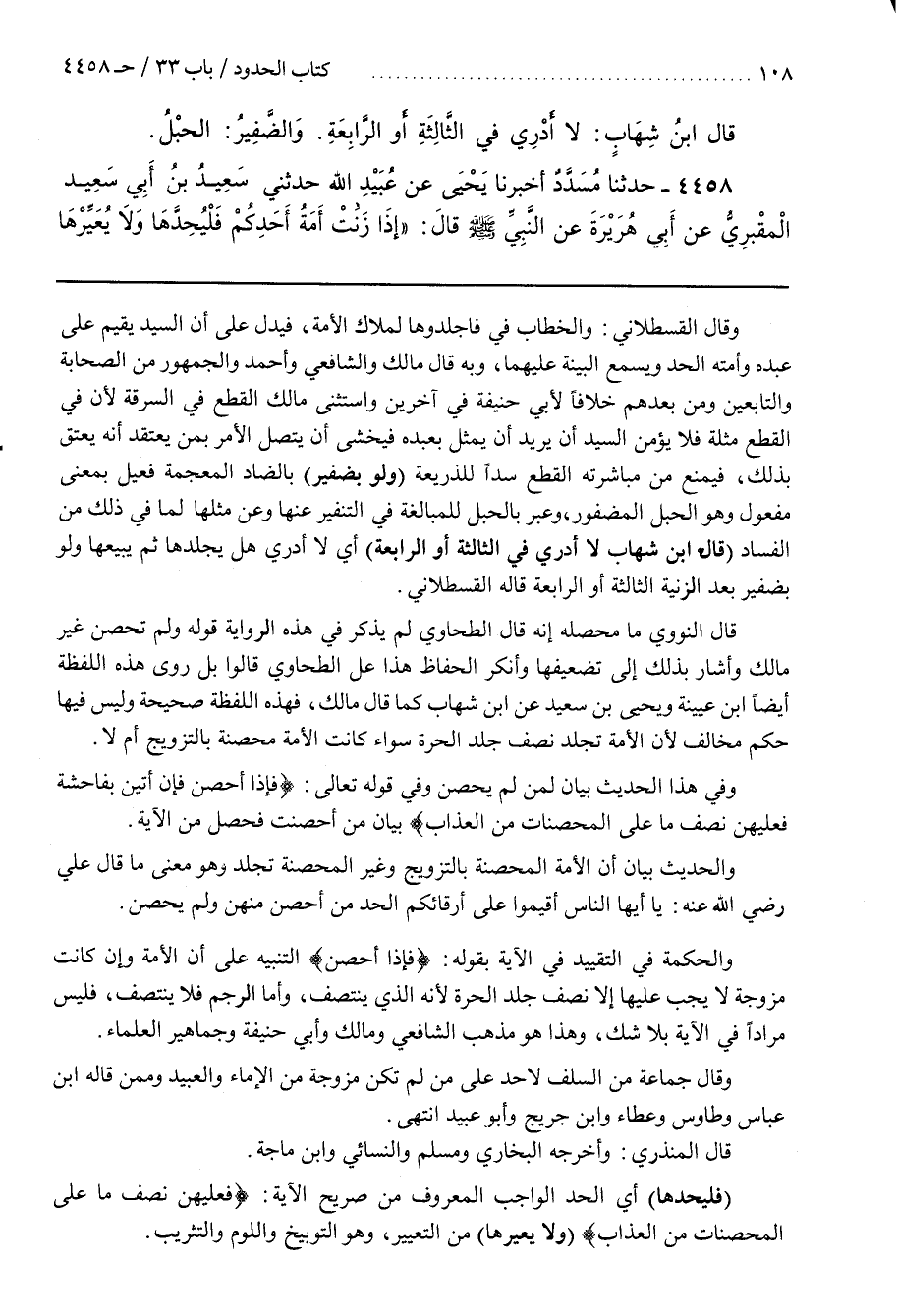 وَالْحَدِيثُ بَيَانٌ أَنَّ الْأَمَةَ الْمُحْصَنَةَ بِالتَّزْوِيجِ وَغَيْرِ الْمُحْصَنَةِ تُجْلَدُ وَهُوَ مَعْنَى مَا قَالَ عَلِيٌّ رَضِيَ اللَّهُ عَنْهُ يَا أَيُّهَا النَّاسُ أَقِيمُوا عَلَى أَرِقَّائِكُمُ الْحَدَّ مَنْ أُحْصِنَّ مِنْهُنَّ وَمَنْ لَمْ يُحْصَنَّ