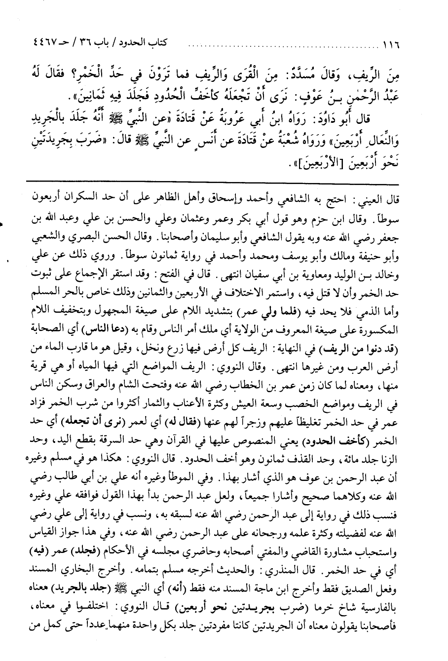 قَالَ فِي الْفَتْحِ وَقَدِ اسْتَقَرَّ الإجماع على ثبوت حد الخمر وأن لاقتل فِيهِ وَاسْتَمَرَّ الِاخْتِلَافُ فِي الْأَرْبَعِينَ وَالثَّمَانِينَ وَذَلِكَ خَاصٌّ بِالْحُرِّ الْمُسْلِمِ وَأَمَّا الذِّمِّيُّ فَلَا يُحَدُّ فِيهِ (فَلَمَّا وُلِّيَ عُمَرُ) بِتَشْدِيدِ اللَّامِ عَلَى صِيغَةِ الْمَجْهُولِ وَبِتَخْفِيفِ اللَّامِ الْمَكْسُورَةِ عَلَى صِيغَةِ الْمَعْرُوفِ مِنَ الْوِلَايَةِ أَيْ مَلَكَ أَمْرَ النَّاسِ وَقَامَ بِهِ (دَعَا النَّاسَ) أَيِ الصَّحَابَةَ (قَدْ دَنَوْا مِنَ الرِّيفِ) فِي النِّهَايَةِ الرِّيفُ كُلُّ أَرْضٍ فِيهَا زَرْعٌ وَنَخْلٌ وَقِيلَ هُوَ مَا قَارَبَ الْمَاءَ مِنْ أَرْضِ الْعَرَبِ وَمِنْ غَيْرِهَا انْتَهَى