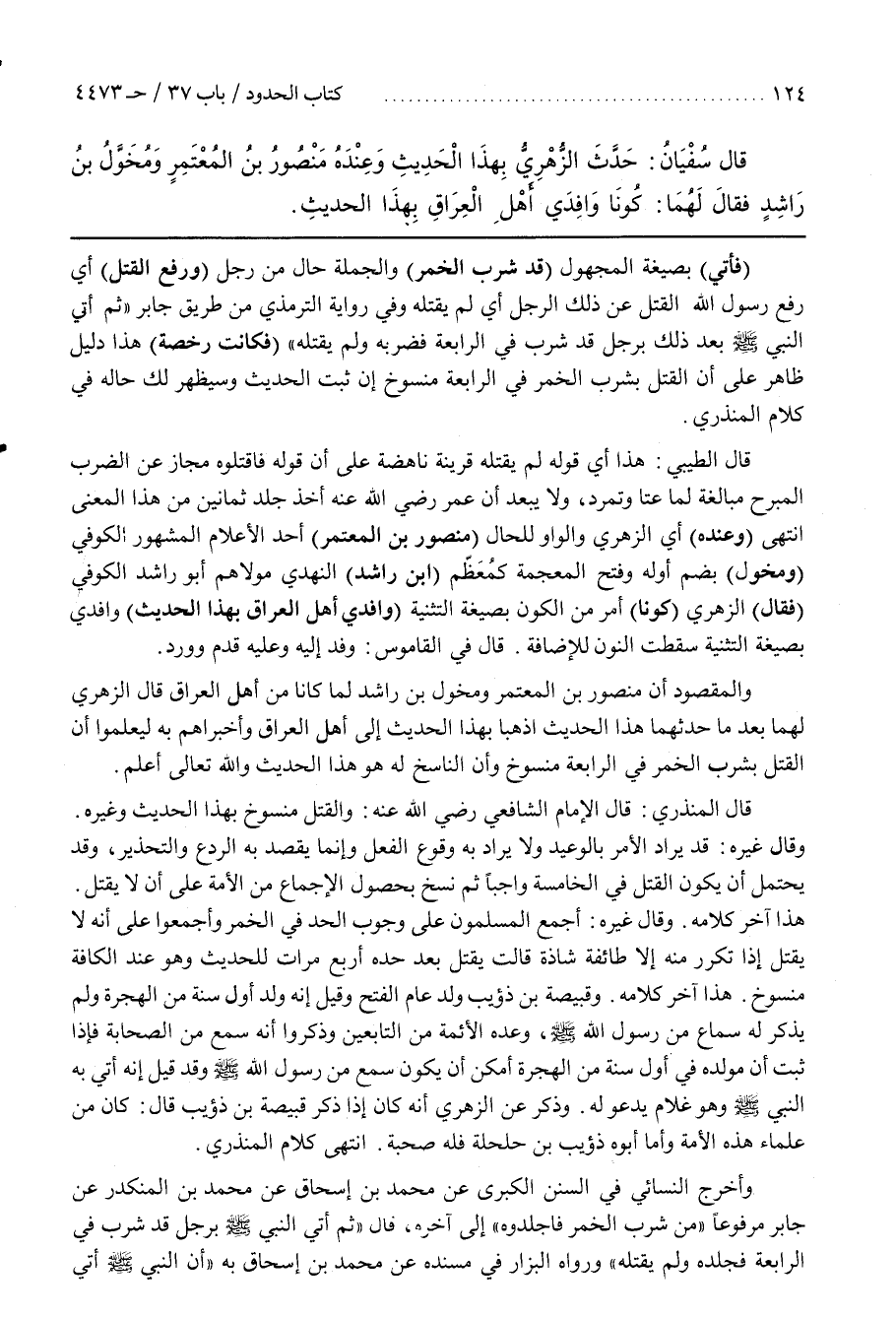 وَالْمَقْصُودُ أَنَّ مَنْصُورَ بْنَ الْمُعْتَمِرِ وَمُخَوَّلَ بْنَ رَاشِدٍ لَمَّا كَانَا مِنْ أَهْلِ الْعِرَاقِ قَالَ الزهري لهما بعد ما حَدَّثَهُمَا هَذَا الْحَدِيثَ اذْهَبَا بِهَذَا الْحَدِيثِ إِلَى أَهْلِ الْعِرَاقِ وَأَخْبِرَاهُمْ بِهِ لِيَعْلَمُوا أَنَّ الْقَتْلَ بِشُرْبِ الْخَمْرِ فِي الرَّابِعَةِ مَنْسُوخٌ وَأَنَّ النَّاسِخَ لَهُ هُوَ هَذَا الْحَدِيثُ وَاللَّهُ تَعَالَى أَعْلَمُ
