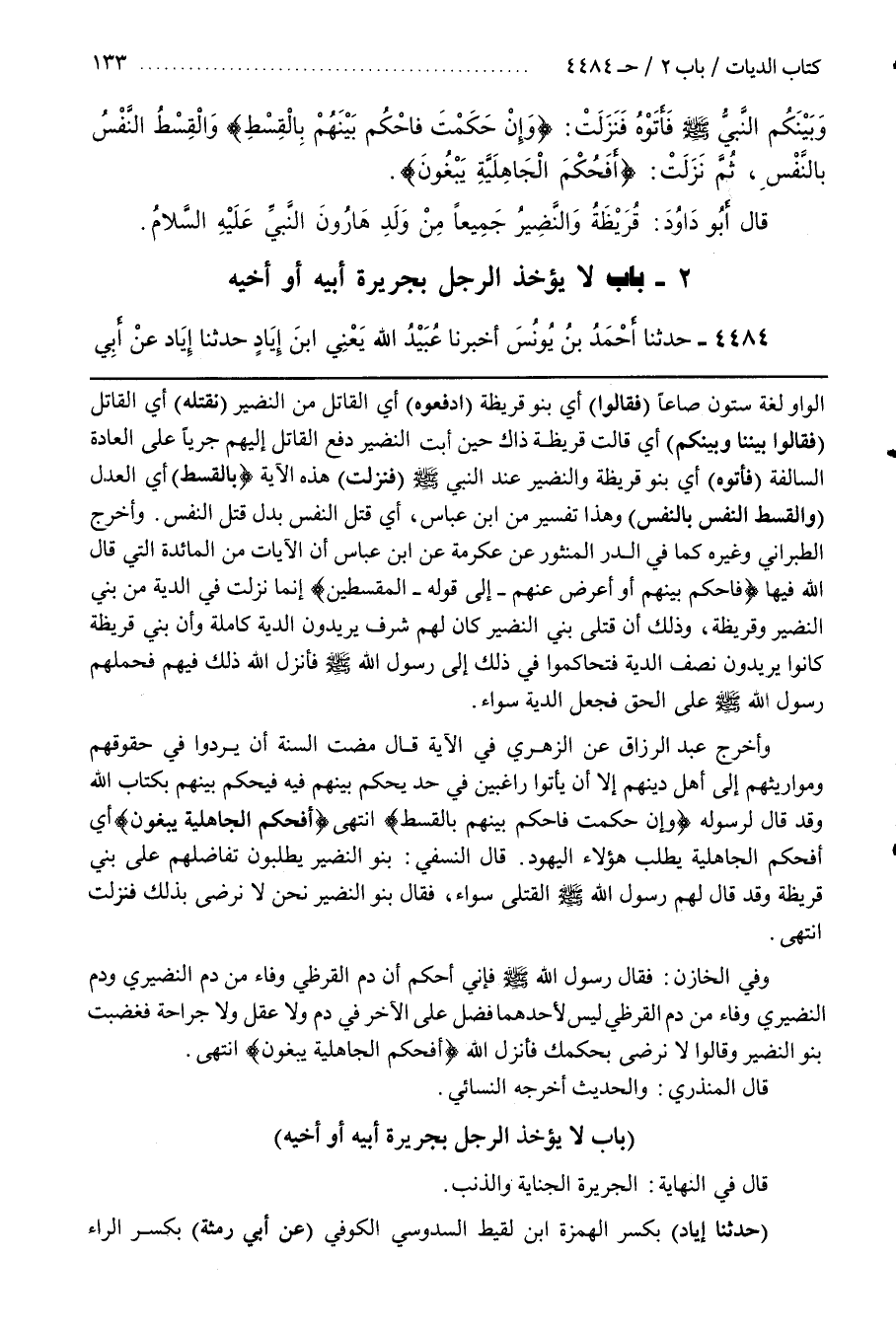 وَأَخْرَجَ الطَّبَرَانِيُّ وَغَيْرُهُ كَمَا فِي الدُّرِّ الْمَنْثُورِ عن عكرمة عن بن عَبَّاسٍ أَنَّ الْآيَاتِ مِنَ الْمَائِدَةِ الَّتِي قَالَ اللَّهُ فِيهَا فَاحْكُمْ بَيْنَهُمْ أَوْ أَعْرِضْ عَنْهُمْ إِلَى قَوْلِهِ الْمُقْسِطِينَ إِنَّمَا نَزَلَتْ فِي الدِّيَةِ مِنْ بَنِي النَّضِيرِ وَقُرَيْظَةَ وَذَلِكَ أَنَّ قَتْلَى بَنِي النَّضِيرِ كَانَ لَهُمْ شَرَفٌ يُرِيدُونَ الدِّيَةَ كَامِلَةً وَأَنَّ بَنِي قُرَيْظَةَ كَانُوا يُرِيدُونَ نِصْفَ الدِّيَةِ فَتَحَاكَمُوا فِي ذَلِكَ إِلَى رَسُولِ اللَّهِ صَلَّى اللَّهُ عَلَيْهِ وَسَلَّمَ فَأَنْزَلَ اللَّهُ ذَلِكَ فِيهِمْ فَحَمَلَهُمْ رَسُولُ اللَّهِ صَلَّى اللَّهُ عَلَيْهِ وَسَلَّمَ عَلَى الْحَقِّ فَجَعَلَ الدِّيَةَ سَوَاءً