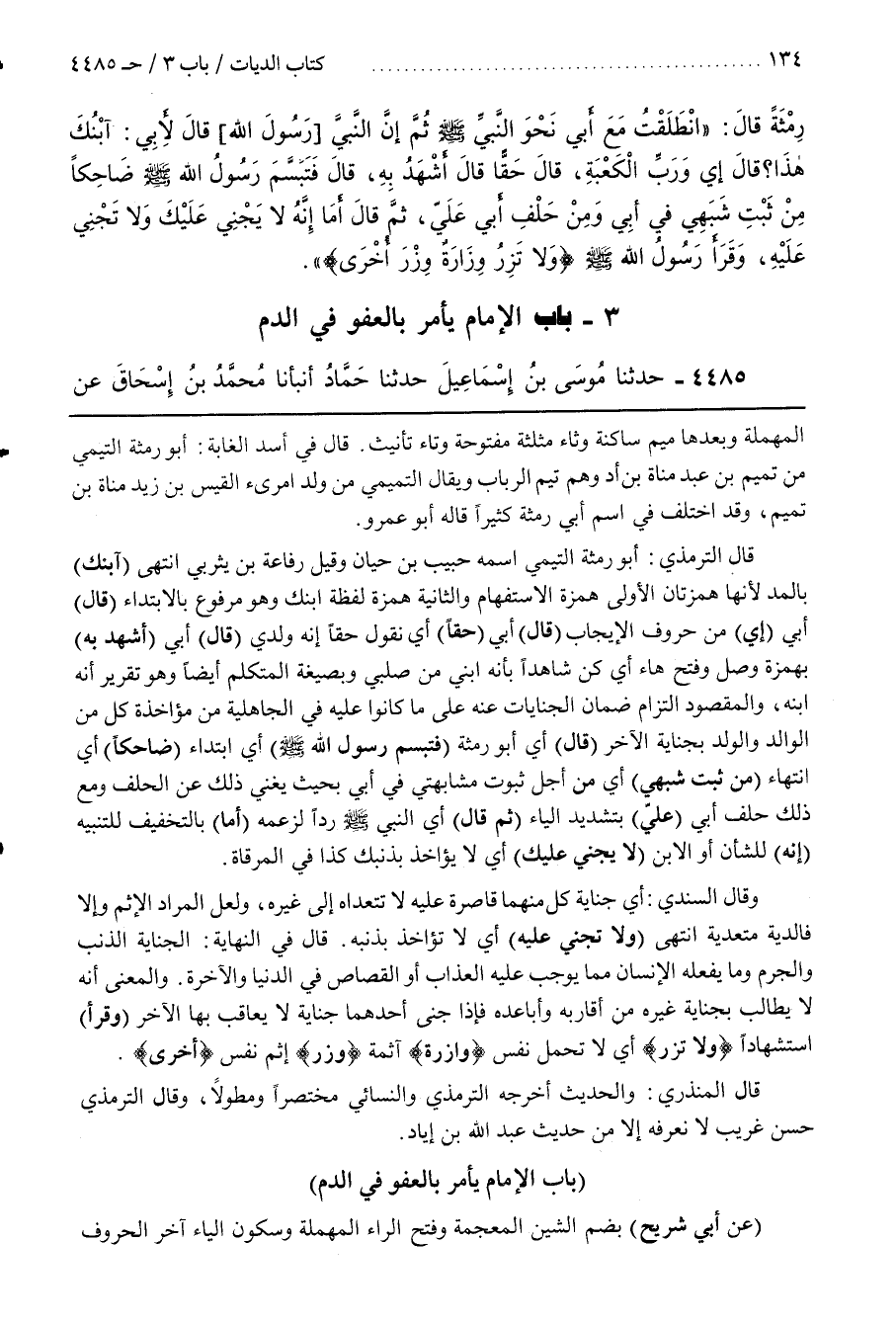 قَالَ التِّرْمِذِيُّ أَبُو رِمْثَةَ التَّيْمِيُّ اسْمُهُ حَبِيبُ بْنُ حَيَّانَ وَقِيلَ رِفَاعَةُ بْنُ يَثْرِبِيٍّ انْتَهَى (آبْنُكَ) بِالْمَدِّ لِأَنَّهَا هَمْزَتَانِ الْأُولَى هَمْزَةُ الِاسْتِفْهَامِ وَالثَّانِيَةُ هَمْزَةُ لَفْظَةِ ابْنِكَ وَهُوَ مَرْفُوعٌ بِالِابْتِدَاءِ (قَالَ) أَبِي (إِي) مِنْ حُرُوفِ الْإِيجَابِ (قَالَ) أَبِي حَقًّا أَيْ نَقُولُ حَقًّا إِنَّهُ وَلَدِي (قَالَ) أَبِي (أَشْهَدُ بِهِ) بِهَمْزَةِ وَصْلٍ وَفَتْحِ هَاءٍ أَيْ كُنْ شَاهِدًا بِأَنَّهُ ابْنِي مِنْ صُلْبِي وَبِصِيغَةِ الْمُتَكَلِّمِ أَيْضًا وَهُوَ تَقْرِيرٌ أَنَّهُ ابْنُهُ وَالْمَقْصُودُ الْتِزَامُ ضَمَانِ الْجِنَايَاتِ عَنْهُ عَلَى مَا كَانُوا عَلَيْهِ فِي الْجَاهِلِيَّةِ مِنْ مُؤَاخَذَةِ كُلٍّ مِنَ الْوَالِدِ وَالْوَلَدِ بِجِنَايَةِ الْآخَرِ (قَالَ) أَيْ أَبُو رِمْثَةَ (فَتَبَسَّمَ رَسُولُ اللَّهِ صَلَّى اللَّهُ عَلَيْهِ وَسَلَّمَ) أي ابتداء (ضاحكا) أي انتهاء (مِنْ ثَبْتِ شَبَهِي) أَيْ مِنْ أَجْلِ ثُبُوتِ مُشَابَهَتِي فِي أَبِي بِحَيْثُ يُغْنِي ذَلِكَ عَنِ الْحَلِفِ وَمَعَ ذَلِكَ حَلِفَ أَبِي (عَلَيَّ) بِتَشْدِيدِ الْيَاءِ (ثُمَّ قَالَ) أَيِ النَّبِيُّ صَلَّى اللَّهُ عَلَيْهِ وَسَلَّمَ رَدًّا لِزَعْمِهِ (أَمَا) بِالتَّخْفِيفِ لِلتَّنْبِيهِ (إِنَّهُ) لِلشَّأْنِ أَوِ الِابْنِ (لَا يَجْنِي عَلَيْكَ) أَيْ لَا يُؤَاخَذُ بِذَنْبِكَ كَذَا فِي الْمِرْقَاةِ