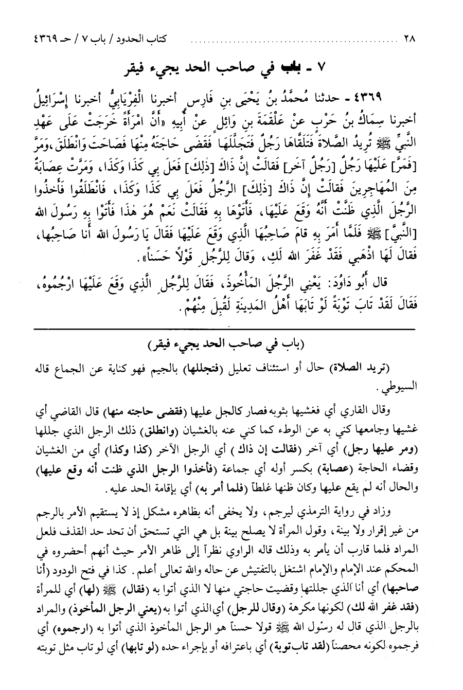 وَقَالَ القارىء أَيْ فَغَشِيَهَا بِثَوْبِهِ فَصَارَ كَالْجُلِّ عَلَيْهِ (فَقَضَى حَاجَتَهُ مِنْهَا) قَالَ الْقَاضِي أَيْ غَشِيَهَا وَجَامَعَهَا كَنَّى بِهِ عَنِ الْوَطْءِ كَمَا كَنَّى عَنْهُ بِالْغَشَيَانِ (وَانْطَلَقَ) ذَلِكَ الرَّجُلُ الَّذِي جَلَّلَهَا (وَمَرَّ عَلَيْهَا رَجُلٌ) أَيْ آخَرُ (فَقَالَتْ إِنَّ ذَاكَ) أَيِ الرَّجُلَ الْآخَرَ (كَذَا وَكَذَا) أَيِ مِنَ الْغَشَيَانِ وَقَضَاءِ الْحَاجَةِ (عِصَابَةٌ) بِكَسْرِ أَوَّلِهِ أَيْ جَمَاعَةٌ (فَأَخَذُوا الرَّجُلَ الَّذِي ظَنَّتْ أَنَّهُ وَقَعَ عَلَيْهَا) وَالْحَالُ أَنَّهُ لَمْ يَقَعْ عَلَيْهَا وَكَانَ ظَنُّهَا غَلَطًا (فَلَمَّا أَمَرَ بِهِ) أَيْ بِإِقَامَةِ الْحَدِّ عَلَيْهِ