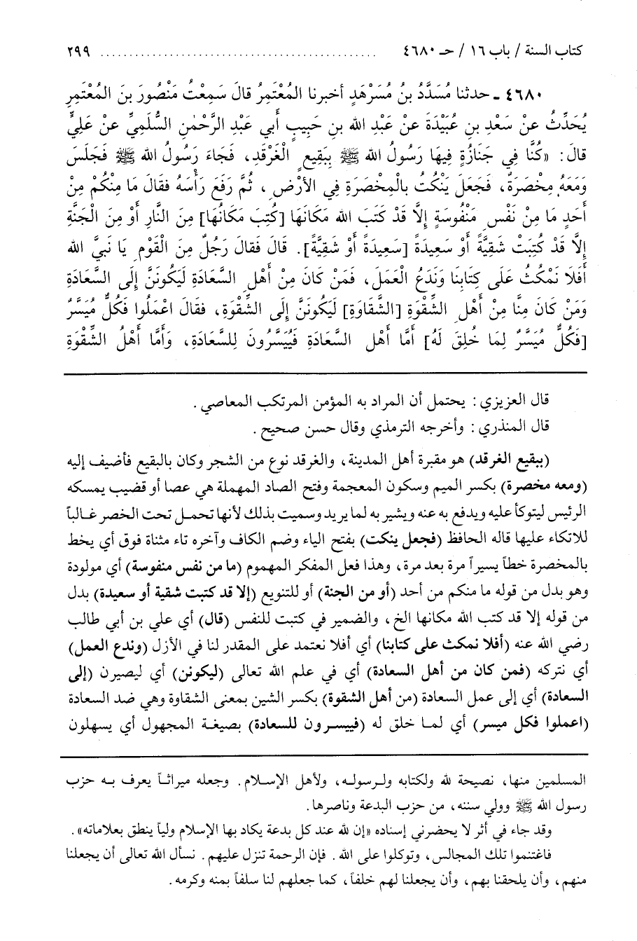 (بِبَقِيعِ الْغَرْقَدِ) هُوَ مَقْبَرَةُ أَهْلِ الْمَدِينَةِ وَالْغَرْقَدُ نَوْعٌ مِنَ الشَّجَرِ وَكَانَ بِالْبَقِيعِ فَأُضِيفَ إِلَيْهِ (وَمَعَهُ مِخْصَرَةٌ) بِكَسْرِ الْمِيمِ وَسُكُونِ الْمُعْجَمَةِ وَفَتْحِ الصَّادِ الْمُهْمَلَةِ هِيَ عَصًا أَوْ قَضِيبٌ يُمْسِكُهُ الرَّئِيسُ لِيَتَوَكَّأَ عَلَيْهِ وَيَدْفَعَ بِهِ عَنْهُ وَيُشِيرُ بِهِ لِمَا يُرِيدُ وَسُمِّيَتْ بِذَلِكَ لِأَنَّهَا تُحْمَلُ تَحْتَ الْخَصْرِ غَالِبًا لِلِاتِّكَاءِ عَلَيْهَا قَالَهُ الْحَافِظُ (فَجَعَلَ يَنْكُتُ) بِفَتْحِ الْيَاءِ وَضَمِّ الْكَافِ وَآخِرُهُ تَاءٌ مُثَنَّاةٌ فَوْقَ أَيْ يَخُطُّ بِالْمِخْصَرَةِ خَطًّا يَسِيرًا مَرَّةً بَعْدَ مَرَّةٍ وَهَذَا فِعْلُ الْمُفَكِّرِ الْمَهْمُومِ (مَا مِنْ نَفْسٍ مَنْفُوسَةٍ) أَيْ مَوْلُودَةٍ وَهُوَ بَدَلٌ مِنْ قَوْلِهِ مَا مِنْكُمْ مِنْ أَحَدٍ (أَوْ مِنَ الْجَنَّةِ) أَوْ لِلتَّنْوِيعِ (إِلَّا قَدْ كُتِبَتْ شَقِيَّةً أَوْ سَعِيدَةً) بَدَلٌ مِنْ قَوْلِهِ إِلَّا قَدْ كَتَبَ اللَّهُ مَكَانَهَا إِلَخْ وَالضَّمِيرُ فِي كُتِبَتْ لِلنَّفْسِ (قَالَ) أَيْ عَلِيِّ بْنِ أَبِي طَالِبٍ رَضِيَ اللَّهُ عَنْهُ (أَفَلَا نَمْكُثُ عَلَى كِتَابِنَا) أَيْ أَفَلَا نَعْتَمِدُ عَلَى الْمُقَدَّرِ لَنَا فِي الْأَزَلِ (وَنَدَعُ الْعَمَلَ) أَيْ نَتْرُكُهُ (فَمَنْ كَانَ مِنْ أَهْلِ السَّعَادَةِ) أَيْ فِي عِلْمِ اللَّهِ تَعَالَى (لَيَكُونَنَّ) أَيْ لَيَصِيرَنَّ (إِلَى السَّعَادَةِ) أَيْ إِلَى عَمَلِ السَّعَادَةِ (مِنْ أَهْلِ الشِّقْوَةِ) بِكَسْرِ الشِّينِ بِمَعْنَى الشَّقَاوَةِ وَهِيَ ضِدُّ السَّعَادَةِ (اعْمَلُوا فَكُلٌّ مُيَسَّرٌ) أَيْ لِمَا خُلِقَ لَهُ (فَيُيَسَّرُونَ لِلسَّعَادَةِ) بِصِيغَةِ الْمَجْهُولِ أَيْ يُسَهَّلُونَ
