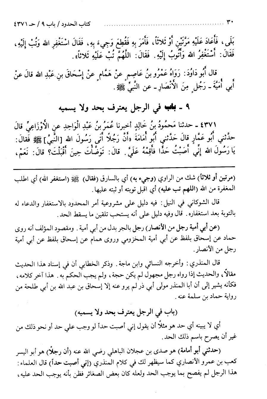 [4381] (حَدَّثَنِي أَبُو أُمَامَةَ) هُوَ صُدَيُّ بْنُ عَجْلَانَ الْبَاهِلِيُّ رَضِيَ اللَّهُ عَنْهُ (أَنَّ رَجُلًا) هُوَ أَبُو الْيَسَرِ كَعْبُ بْنُ عَمْرٍو الْأَنْصَارِيُّ كَمَا سَيَظْهَرُ لَكَ فِي كَلَامِ الْمُنْذِرِيِّ (إِنِّي أَصَبْتُ حَدًّا) قَالَ الْعُلَمَاءُ هَذَا الرَّجُلُ لَمْ يُفْصِحْ بِمَا يُوجِبُ الْحَدَّ وَلَعَلَّهُ كَانَ بَعْضَ الصَّغَائِرِ فَظَنَّ بِأَنَّهُ يُوجِبُ الْحَدَّ عَلَيْهِ