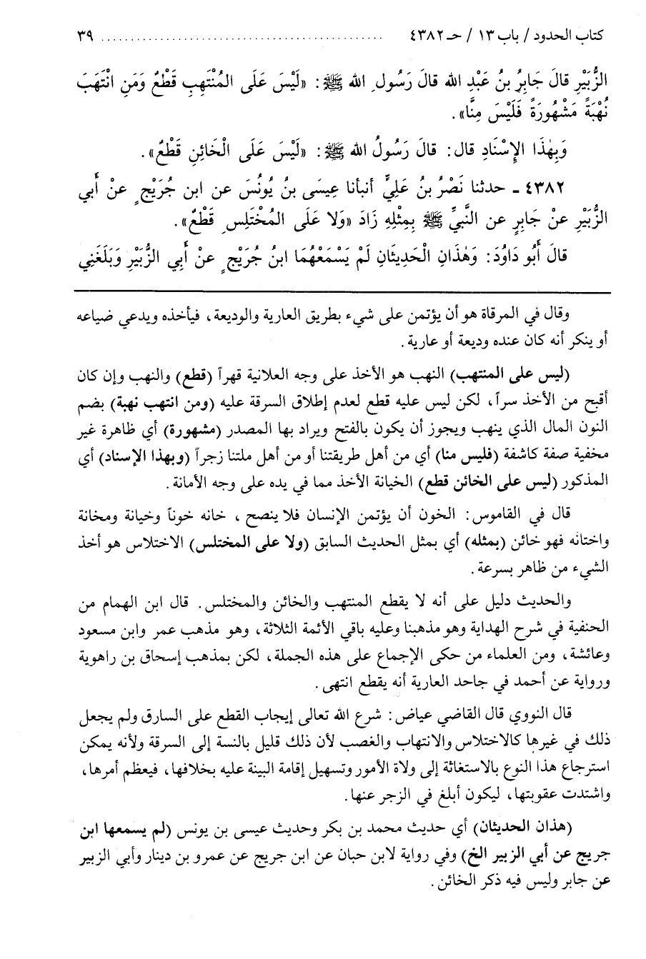 [4391] (لَيْسَ عَلَى الْمُنْتَهِبِ) النَّهْبُ هُوَ الْأَخْذُ عَلَى وَجْهِ الْعَلَانِيَةِ قَهْرًا (قَطْعٌ) وَالنَّهْبُ وَإِنْ كَانَ أَقْبَحَ مِنَ الْأَخْذِ سِرًّا لَكِنْ لَيْسَ عَلَيْهِ قَطْعٌ لِعَدَمِ إِطْلَاقِ السَّرِقَةِ عَلَيْهِ (وَمَنِ انْتَهَبَ نُهْبَةً) بِضَمِّ النُّونِ الْمَالُ الَّذِي يُنْهَبُ وَيَجُوزُ أَنْ يَكُونَ بِالْفَتْحِ وَيُرَادُ بِهَا الْمَصْدَرُ (مَشْهُورَةً) أَيْ ظَاهِرَةً غَيْرَ مَخْفِيَّةٍ صِفَةً كَاشِفَةً (فَلَيْسَ مِنَّا) أَيْ مِنْ أَهْلِ طَرِيقَتِنَا أَوْ مِنْ أَهْلِ مِلَّتِنَا زَجْرًا [4392] (وَبِهَذَا الْإِسْنَادِ) أَيِ الْمَذْكُورِ (لَيْسَ عَلَى الْخَائِنِ قَطْعٌ) الْخِيَانَةُ الْأَخْذُ مِمَّا فِي يَدِهِ عَلَى وَجْهِ الْأَمَانَةِ