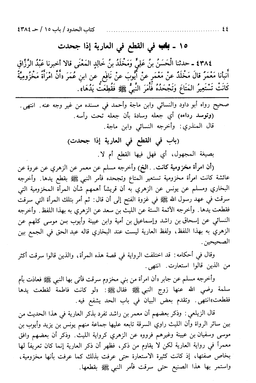 قَالَ الزَّيْلَعِيُّ وَذَكَرَ بَعْضُهُمْ أَنَّ مَعْمَرَ بْنَ رَاشِدٍ تَفَرَّدَ بِذِكْرِ الْعَارِيَةِ فِي هَذَا الْحَدِيثِ مِنْ بَيْنِ سَائِرِ الرُّوَاةِ وَأَنَّ اللَّيْثَ رَاوِيَ السَّرِقَةِ تَابَعَهُ عَلَيْهَا جَمَاعَةٌ مِنْهُمْ يُونُسُ بْنُ يَزِيدَ وَأَيُّوبُ بْنُ مُوسَى وَسُفْيَانُ بْنُ عُيَيْنَةَ وَغَيْرُهُمْ فَرَوَوْهُ عَنِ الزُّهْرِيِّ كَرِوَايَةِ اللَّيْثِ