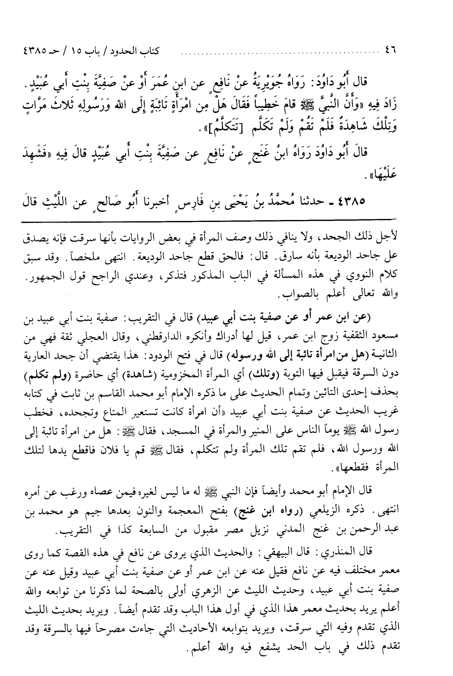 (عن بن عُمَرَ أَوْ عَنْ صَفِيَّةَ بِنْتِ أَبِي عُبَيْدٍ) قَالَ فِي التَّقْرِيبِ صَفِيَّةُ بِنْتُ أَبِي عُبَيْدِ بن مسعود الثقفية زوج بن عُمَرَ قِيلَ لَهَا إِدْرَاكٌ وَأَنْكَرَهُ الدَّارَقُطْنِيُّ وَقَالَ الْعِجْلِيُّ ثِقَةٌ فَهِيَ مِنَ الثَّانِيَةِ (هَلْ مِنَ امْرَأَةٍ تَائِبَةٍ إِلَى اللَّهِ وَرَسُولِهِ) قَالَ فِي فَتْحِ الْوَدُودِ هَذَا يَقْتَضِي أَنَّ جَحْدَ الْعَارِيَةِ دُونَ السَّرِقَةِ فَيُقْبَلُ فِيهَا التَّوْبَةُ (وَتِلْكَ) أَيِ الْمَرْأَةُ الْمَخْزُومِيَّةُ (شَاهِدَةٌ) أَيْ حَاضِرَةٌ (وَلَمْ تَكَلَّمْ) بِحَذْفِ إِحْدَى التَّاءَيْنِ وَتَمَامُ الْحَدِيثِ عَلَى مَا ذَكَرَهُ الْإِمَامُ أَبُو مُحَمَّدٍ الْقَاسِمُ بْنُ ثَابِتٍ فِي كِتَابِهِ غَرِيبِ الْحَدِيثِ عَنْ صَفِيَّةَ بِنْتِ أَبِي عُبَيْدٍ أَنَّ امْرَأَةً كَانَتْ تَسْتَعِيرُ الْمَتَاعَ وَتَجْحَدُهُ فَخَطَبَ رَسُولُ اللَّهِ صَلَّى اللَّهُ عَلَيْهِ وَسَلَّمَ يَوْمًا النَّاسَ عَلَى الْمِنْبَرِ وَالْمَرْأَةُ فِي الْمَسْجِدِ فَقَالَ صَلَّى اللَّهُ عَلَيْهِ وَسَلَّمَ هَلْ مِنَ امْرَأَةٍ تَائِبَةٍ إِلَى اللَّهِ وَرَسُولِ اللَّهِ فَلَمْ تَقُمْ تِلْكَ الْمَرْأَةُ وَلَمْ تَتَكَلَّمْ فَقَالَ صَلَّى اللَّهُ عَلَيْهِ وَسَلَّمَ قُمْ يَا فُلَانُ فَاقْطَعْ يَدَهَا لِتِلْكَ الْمَرْأَةِ فَقَطَعَهَا