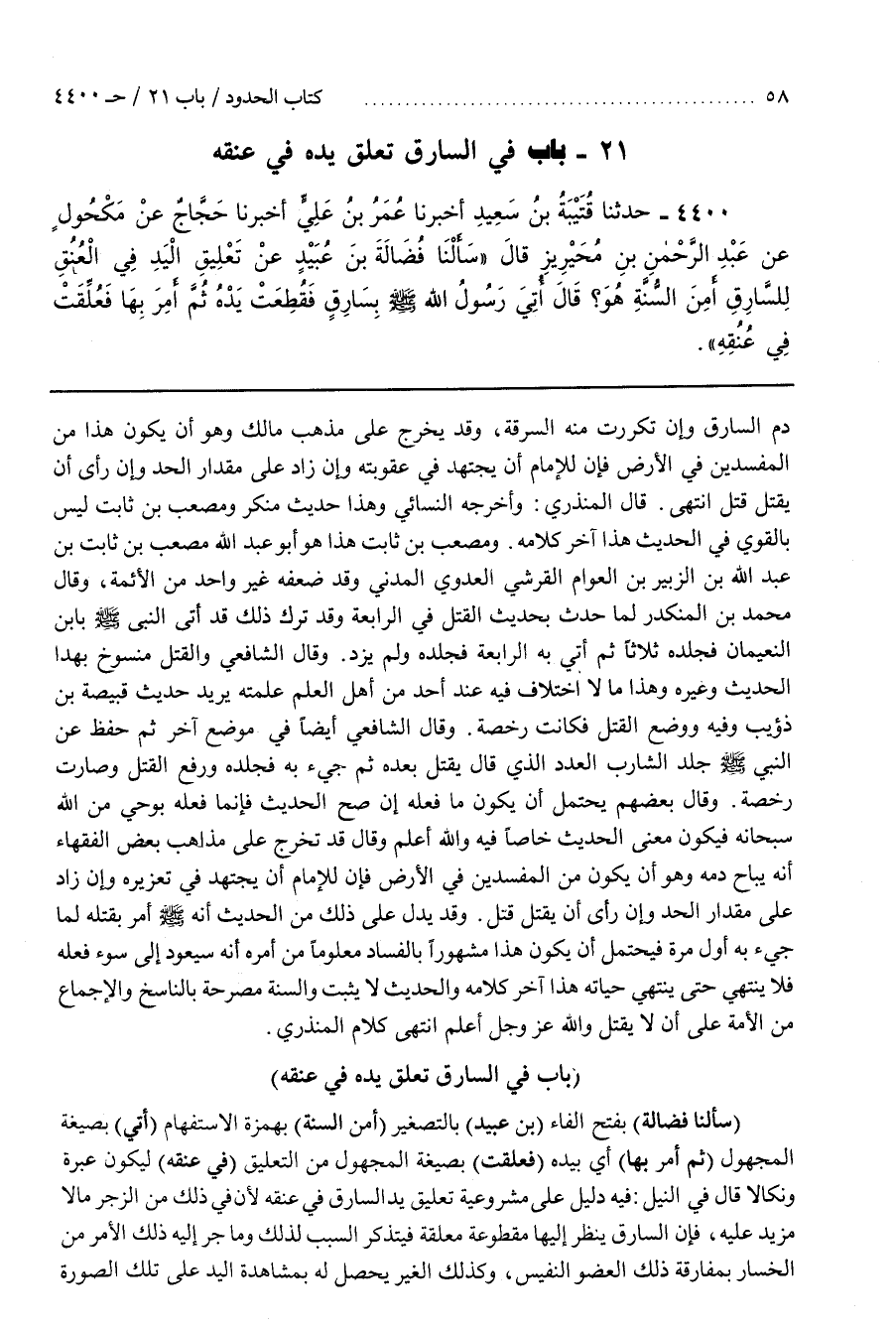 [4411] (سَأَلْنَا فَضَالَةَ) بِفَتْحِ الْفَاءِ (بْنَ عُبَيْدٍ) بِالتَّصْغِيرِ (أَمِنَ السُّنَّةِ) بِهَمْزَةِ الِاسْتِفْهَامِ (أُتِيَ) بِصِيغَةِ الْمَجْهُولِ (ثُمَّ أَمَرَ بِهَا) أَيْ بِيَدِهِ (فَعُلِّقَتْ) بِصِيغَةِ الْمَجْهُولِ مِنَ التَّعْلِيقِ (فِي عُنُقِهِ) لِيَكُونَ عِبْرَةً وَنَكَالًا قَالَ فِي النَّيْلِ فِيهِ دَلِيلٌ عَلَى مَشْرُوعِيَّةِ تَعْلِيقِ يَدِ السَّارِقِ فِي عُنُقِهِ لِأَنَّ فِي ذَلِكَ مِنَ الزَّجْرِ مَا لَا مَزِيدَ عَلَيْهِ فَإِنَّ السَّارِقَ يَنْظُرُ إِلَيْهَا مقطوعة معلقة فيتذكر السبب لذلك وماجر إِلَيْهِ ذَلِكَ الْأَمْرُ مِنَ الْخَسَارِ بِمُفَارَقَةِ ذَلِكَ الْعُضْوِ النَّفِيسِ وَكَذَلِكَ الْغَيْرُ يَحْصُلُ لَهُ بِمُشَاهَدَةِ الْيَدِ عَلَى تِلْكَ الصُّورَةِ