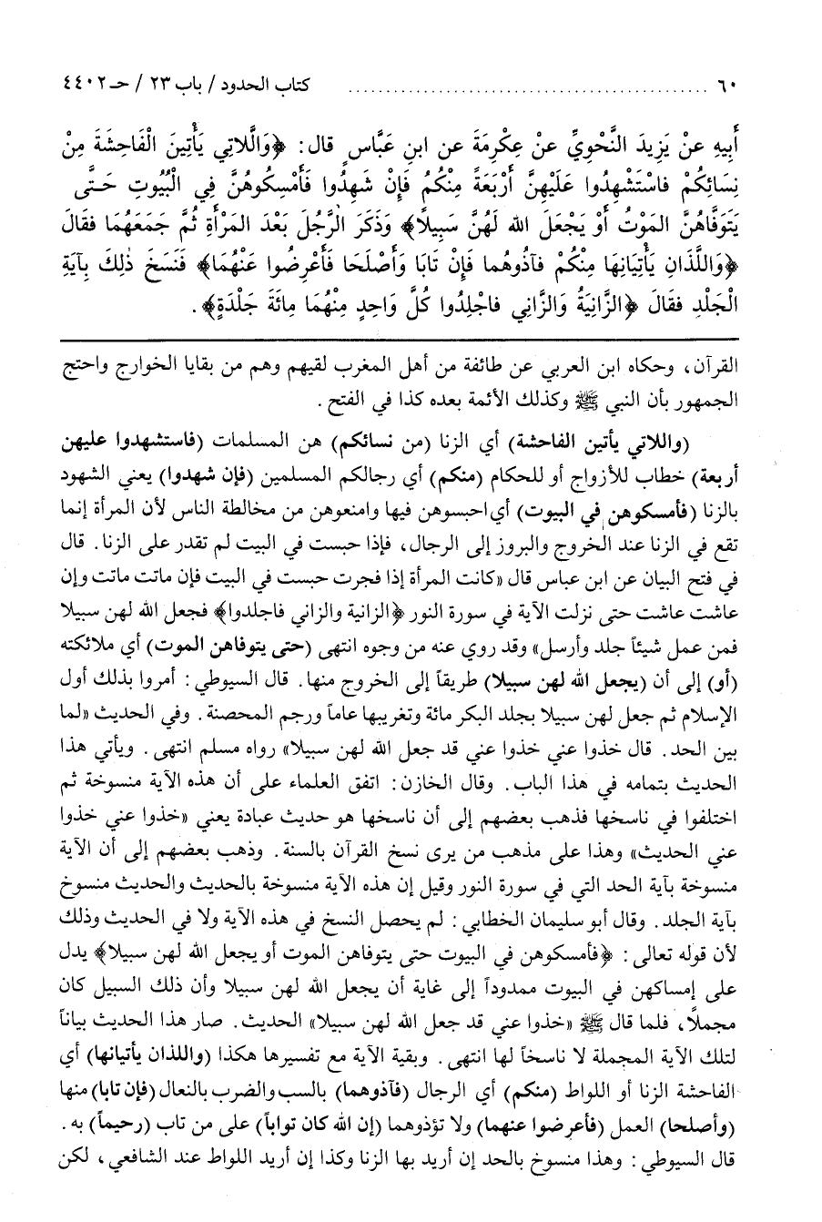قَالَ السُّيُوطِيُّ أُمِرُوا بِذَلِكَ أَوَّلَ الْإِسْلَامِ ثُمَّ جَعَلَ لَهُنَّ سَبِيلًا بِجَلْدِ الْبِكْرِ مِائَةً وَتَغْرِيبِهَا عَامًا وَرَجْمِ الْمُحْصَنَةِ