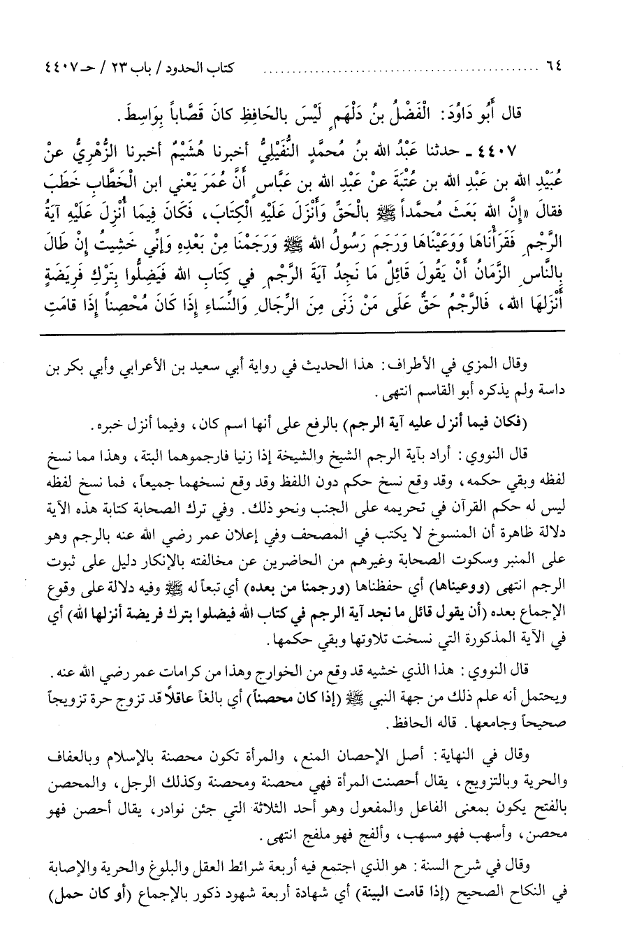 قَالَ النَّوَوِيُّ أَرَادَ بِآيَةِ الرَّجْمِ الشَّيْخَ وَالشَّيْخَةَ إِذَا زَنَيَا فَارْجُمُوهُمَا الْبَتَّةَ وَهَذَا مِمَّا نُسِخَ لَفْظُهُ وَبَقِيَ حُكْمُهُ وَقَدْ وَقَعَ نَسْخُ حُكْمٍ دُونَ اللَّفْظِ وَقَدْ وَقَعَ نَسْخُهُمَا جَمِيعًا فَمَا نُسِخَ لَفْظُهُ لَيْسَ لَهُ حُكْمُ الْقُرْآنِ فِي تَحْرِيمِهِ عَلَى الْجُنُبِ وَنَحْوِ ذَلِكَ