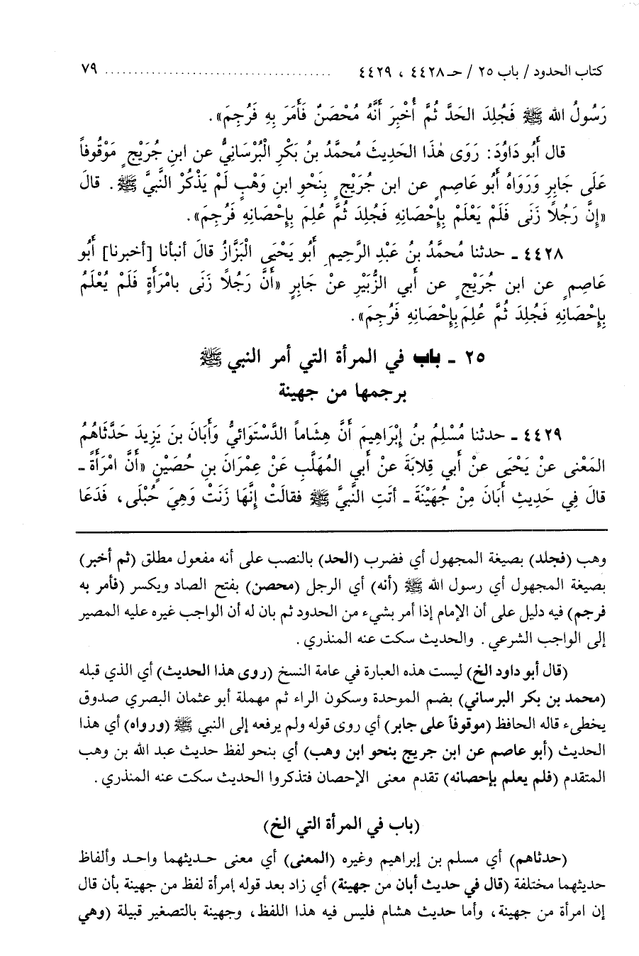 وَهْبٍ (فَجُلِدَ) بِصِيغَةِ الْمَجْهُولِ أَيْ فَضُرِبَ (الْحَدَّ) بِالنَّصْبِ عَلَى أَنَّهُ مَفْعُولٌ مُطْلَقٌ (ثُمَّ أُخْبِرَ) بصيغة المجهول أي رسول الله (أَنَّهُ) أَيِ الرَّجُلَ مُحْصَنٌ بِفَتْحِ الصَّادِ وَيُكْسَرُ (فَأَمَرَ بِهِ فَرُجِمَ) فِيهِ دَلِيلٌ عَلَى أَنَّ الإمام إذا أمر بشي مِنَ الْحُدُودِ ثُمَّ بَانَ لَهُ أَنَّ الْوَاجِبَ غَيْرُهُ عَلَيْهِ الْمَصِيرُ إِلَى الْوَاجِبِ الشَّرْعِيِّ