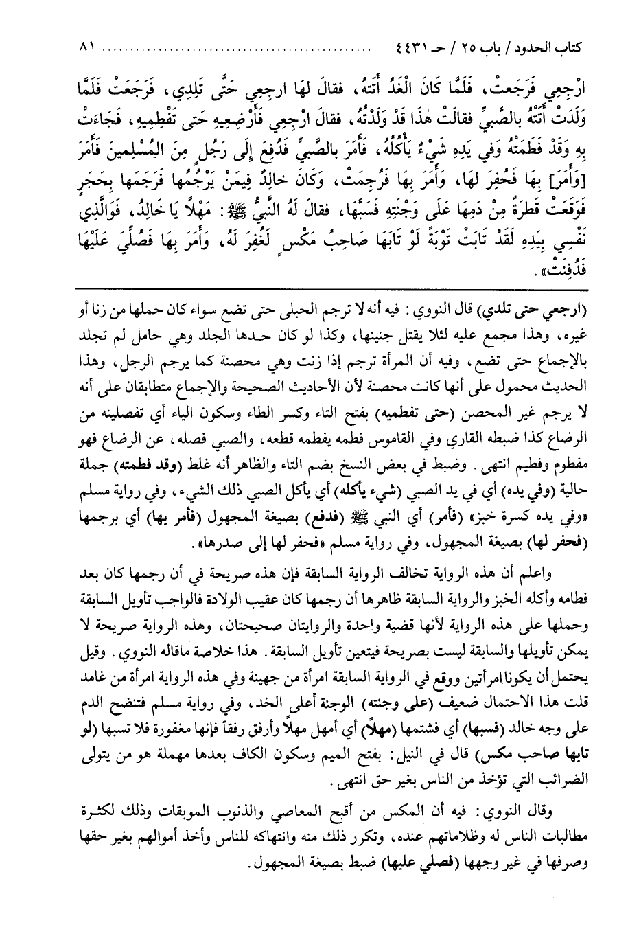 (ارْجِعِي حَتَّى تَلِدِي) قَالَ النَّوَوِيُّ فِيهِ أَنَّهُ لَا تُرْجَمُ الْحُبْلَى حَتَّى تَضَعَ سَوَاءٌ كَانَ حَمْلُهَا مِنْ زِنًا أَوْ غَيْرِهِ وَهَذَا مُجْمَعٌ عَلَيْهِ لِئَلَّا يُقْتَلَ جَنِينُهَا وَكَذَا لَوْ كَانَ حَدُّهَا الْجَلْدَ وَهِيَ حَامِلٌ لَمْ تُجْلَدْ بِالْإِجْمَاعِ حَتَّى تَضَعَ وَفِيهِ أَنَّ الْمَرْأَةَ تُرْجَمُ إِذَا زَنَتْ وَهِيَ مُحْصَنَةٌ كَمَا يُرْجَمُ الرَّجُلُ وَهَذَا الْحَدِيثُ مَحْمُولٌ عَلَى أَنَّهَا كَانَتْ مُحْصَنَةً لِأَنَّ الْأَحَادِيثَ الصَّحِيحَةَ وَالْإِجْمَاعَ مُتَطَابِقَانِ عَلَى أَنَّهُ لَا يُرْجَمُ غَيْرُ الْمُحْصَنِ (حَتَّى تَفْطِمِيهِ) بِفَتْحِ التَّاءِ وَكَسْرِ الطَّاءِ وَسُكُونِ الْيَاءِ أَيْ تَفْصِلِينَهُ مِنَ الرضاع كذا ضبطه القارىء وَفِي الْقَامُوسِ فَطَمَهُ يَفْطِمُهُ قَطَعَهُ وَالصَّبِيَّ فَصَلَهُ عَنِ الرَّضَاعِ فَهُوَ مَفْطُومٌ وَفَطِيمٌ انْتَهَى