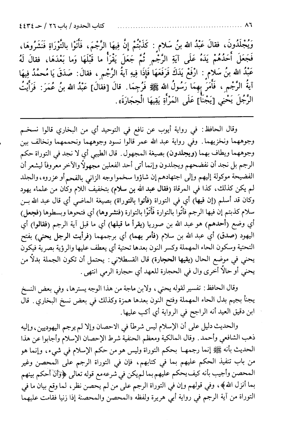 وَقَالَ الْمَالِكِيَّةُ وَمُعْظَمُ الْحَنَفِيَّةِ شَرْطُ الْإِحْصَانِ الْإِسْلَامُ وَأَجَابُوا عَنْ هذا الحديث بأنه إِنَّمَا رَجَمَهُمَا بِحُكْمِ التَّوْرَاةِ وَلَيْسَ هُوَ مِنْ حُكْمِ الْإِسْلَامِ فِي شَيْءٍ وَإِنَّمَا هُوَ مِنْ بَابِ تَنْفِيذِ الْحُكْمِ عَلَيْهِمْ بِمَا فِي كِتَابِهِمْ فَإِنَّ فِي التَّوْرَاةِ الرَّجْمَ عَلَى الْمُحْصَنِ وَغَيْرِ الْمُحْصَنِ وَأُجِيبَ بِأَنَّهُ كَيْفَ يَحْكُمُ عَلَيْهِمْ بِمَا لَمْ يَكُنْ فِي شَرْعِهِ مَعَ قَوْلِهِ تَعَالَى وأن أحكم بينهم بما أنزل الله وَفِي قَوْلِهِمْ وَإِنَّ فِي التَّوْرَاةِ الرَّجْمَ عَلَى مَنْ لَمْ يُحْصِنْ نَظَرٌ لِمَا وَقَعَ بَيَانُ مَا فِي التَّوْرَاةِ مِنْ آيَةِ الرَّجْمِ فِي رِوَايَةِ أَبِي هُرَيْرَةَ وَلَفْظُهُ الْمُحْصَنُ وَالْمُحْصَنَةُ إِذَا زَنَيَا فَقَامَتْ عَلَيْهِمَا