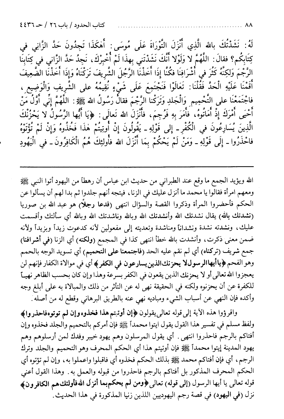 اللَّهِ وَيُؤَيِّدُ الْجَمْعَ مَا وَقَعَ عِنْدَ الطَّبَرَانِيِّ من حديث بن عَبَّاسٍ أَنَّ رَهْطًا مِنَ الْيَهُودِ أَتَوُا النَّبِيَّ وَمَعَهُمُ امْرَأَةٌ فَقَالُوا يَا مُحَمَّدُ مَا أُنْزِلَ عليك في الزنى فَيَتَّجِهُ أَنَّهُمْ جَلَدُوا الرَّجُلَ ثُمَّ بَدَا لَهُمْ أَنْ يَسْأَلُوا عَنِ الْحُكْمِ فَأَحْضَرُوا الْمَرْأَةَ وَذَكَرُوا الْقِصَّةَ وَالسُّؤَالَ انْتَهَى (فَدَعَا رَجُلًا) هُوَ عَبْدُ اللَّهِ بْنُ صُورِيَّا (نَشَدْتُكَ بِاللَّهِ) يُقَالُ نَشَدْتُكَ اللَّهَ وَأَنْشَدْتُكَ اللَّهَ وَبِاللَّهِ وَنَاشَدْتُكَ اللَّهَ وَبِاللَّهِ أَيْ سَأَلْتُكَ وَأَقْسَمْتُ عَلَيْكَ وَنَشَدْتُهُ نِشْدَةً وَنِشْدَانًا وَمُنَاشَدَةً وَتَعْدِيَتُهُ إِلَى مَفْعُولَيْنِ لِأَنَّهُ كَدَعَوْتُ زَيْدًا وبزيدا وَلِأَنَّهُ ضُمِّنَ مَعْنَى ذَكَرْتُ وَأَنْشَدْتُ بِاللَّهِ خَطَأٌ انتهى كذا في المجمع (ولكنه) أي الزنى (فِي أَشْرَافِنَا) جَمْعُ شَرِيفٍ (تَرَكْنَاهُ) أَيْ لَمْ نُقِمْ عَلَيْهِ الْحَدَّ (فَاجْتَمَعْنَا عَلَى التَّحْمِيمِ) أَيْ تَسْوِيدِ الْوَجْهِ بِالْحُمَمِ وَهُوَ الْفَحْمُ يَا أَيُّهَا الرَّسُولُ لَا يَحْزُنْكَ الَّذِينَ يُسَارِعُونَ فِي الْكُفْرِ أَيْ فِي مُوَالَاةِ الْكُفَّارِ فَإِنَّهُمْ لَنْ يُعْجِزُوا اللَّهَ تَعَالَى أَوْ لَا يَحْزُنْكَ الَّذِينَ يَقَعُونَ فِي الْكُفْرِ بِسُرْعَةٍ وَهَذَا وَإِنْ كَانَ بِحَسَبِ الظَّاهِرِ نَهْيًا لِلْكَفَرَةِ عَنْ أَنْ يُحْزِنُوهُ وَلَكِنَّهُ فِي الْحَقِيقَةِ نَهْيٌ لَهُ عَنِ التَّأَثُّرِ مِنْ ذَلِكَ وَالْمُبَالَاةِ بِهِ عَلَى أَبْلَغِ وَجْهٍ وَأَوْكَدِهِ فَإِنَّ النَّهْيَ عَنْ أَسْبَابِ الشَّيْءِ وَمَبَادِيهِ نَهْيٌ عَنْهُ بِالطَّرِيقِ الْبُرْهَانِيِّ وَقَطْعٌ لَهُ مِنْ أَصْلِهِ