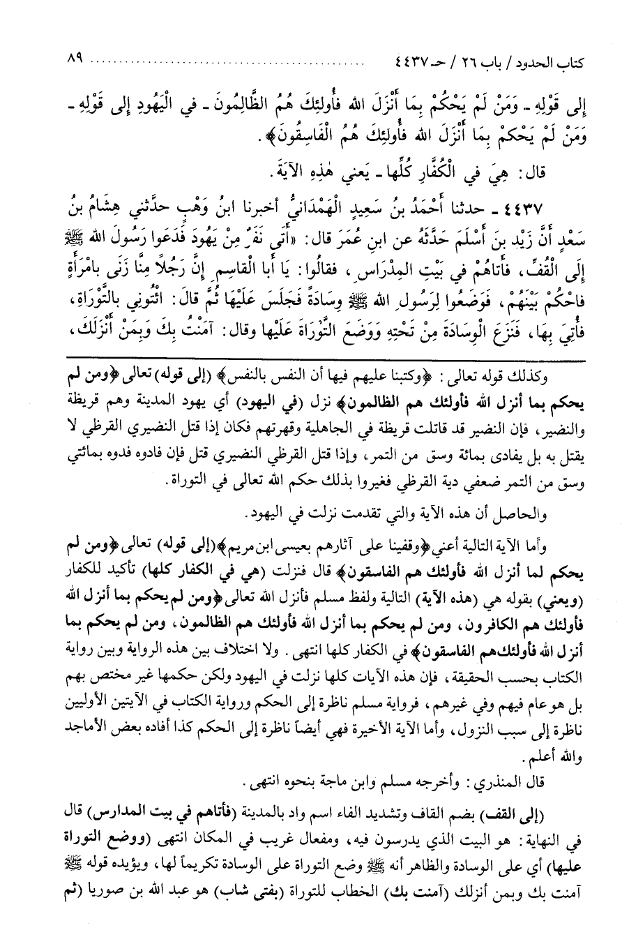 [4449] (إِلَى الْقُفِّ) بِضَمِّ الْقَافِ وَتَشْدِيدِ الْفَاءِ اسْمُ وَادٍ بِالْمَدِينَةِ (فَأَتَاهُمْ فِي بَيْتِ الْمِدْرَاسِ) قَالَ فِي النِّهَايَةِ هُوَ الْبَيْتُ الَّذِي يَدْرُسُونَ فِيهِ وَمِفْعَالٌ غَرِيبٌ فِي الْمَكَانِ انْتَهَى (وَوَضَعَ التَّوْرَاةَ عَلَيْهَا) أَيْ عَلَى الْوِسَادَةِ والظاهر أنه وَضَعَ التَّوْرَاةَ عَلَى الْوِسَادَةِ تَكْرِيمًا لَهَا وَيُؤَيِّدُهُ قَوْلُهُ صَلَّى اللَّهُ عَلَيْهِ وَسَلَّمَ آمَنْتُ بِكِ وَبِمَنْ أَنْزَلَكِ (آمَنْتُ بِكَ) الْخِطَابُ لِلتَّوْرَاةِ (بِفَتًى شَابٍّ) هُوَ عَبْدُ اللَّهِ بْنُ صُورِيَّا