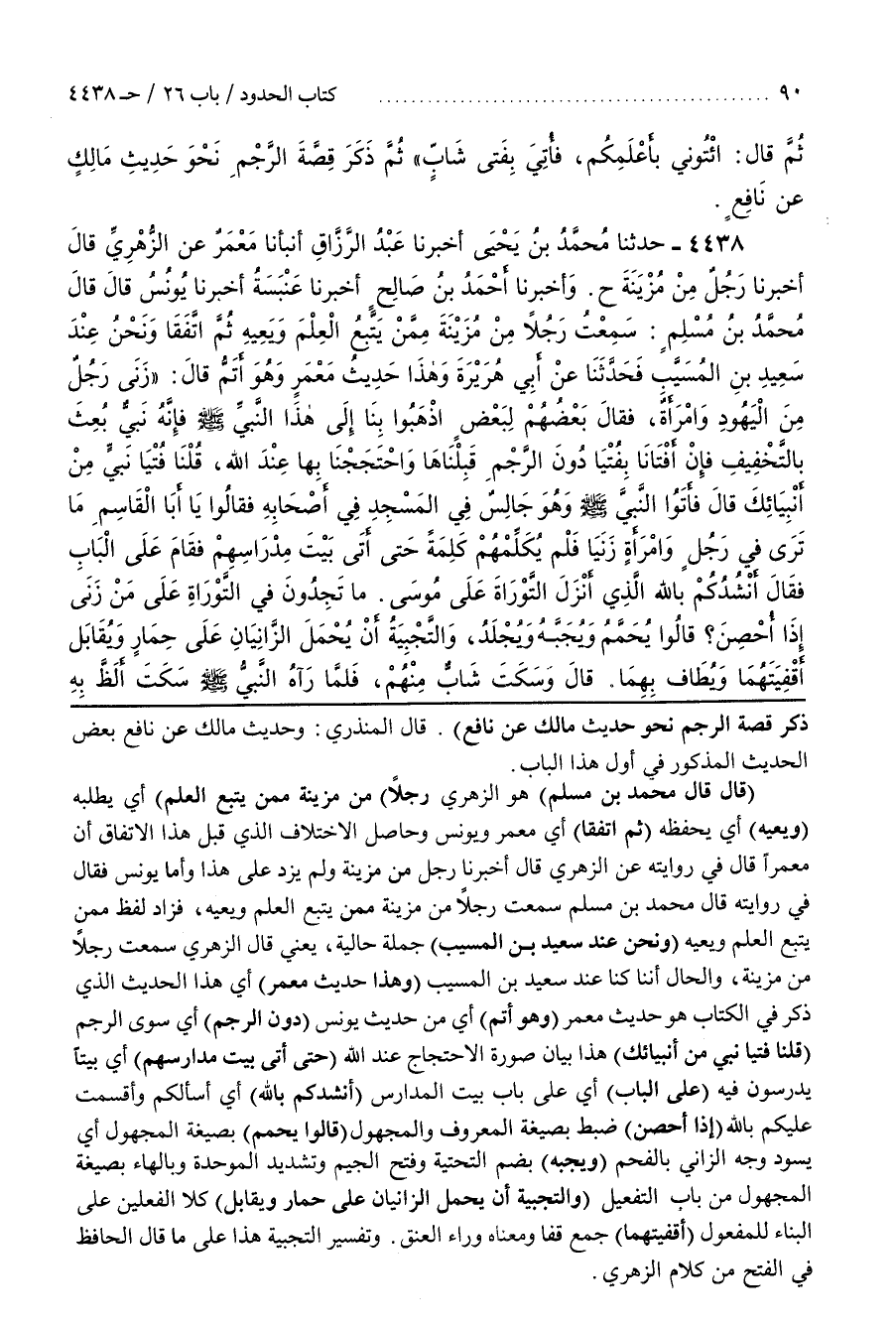 [4450] (قَالَ قَالَ مُحَمَّدُ بْنُ مُسْلِمٍ) هُوَ الزُّهْرِيُّ (رَجُلًا مِنْ مُزَيْنَةَ مِمَّنْ يَتَّبِعُ الْعِلْمَ) أَيْ يَطْلُبُهُ (وَيَعِيهِ) أَيْ يَحْفَظُهُ (ثُمَّ اتَّفَقَا) أَيْ مَعْمَرٌ وَيُونُسُ وَحَاصِلُ الِاخْتِلَافِ الَّذِي قَبْلَ هَذَا الِاتِّفَاقِ أَنَّ مَعْمَرًا قَالَ فِي رِوَايَتِهِ عَنِ الزُّهْرِيِّ قَالَ أَخْبَرَنَا رَجُلٌ مِنْ مُزَيْنَةَ وَلَمْ يَزِدْ عَلَى هَذَا وَأَمَّا يُونُسُ فَقَالَ فِي رِوَايَتِهِ قَالَ مُحَمَّدُ بْنُ مُسْلِمٍ سَمِعْتُ رَجُلًا مِنْ مُزَيْنَةَ مِمَّنْ يَتَّبِعُ الْعِلْمَ وَيَعِيهِ فَزَادَ لَفْظَ مِمَّنْ يَتَّبِعُ الْعِلْمَ وَيَعِيهِ (وَنَحْنُ عِنْدَ سَعِيدِ بْنِ الْمُسَيَّبِ) جُمْلَةٌ حَالِيَّةٌ يَعْنِي قَالَ الزُّهْرِيُّ سَمِعْتُ رَجُلًا مِنْ مُزَيْنَةَ وَالْحَالُ أَنَّنَا كُنَّا عِنْدَ سَعِيدِ بْنِ الْمُسَيَّبِ (وَهَذَا حَدِيثُ مَعْمَرٍ) أَيْ هَذَا الْحَدِيثُ الَّذِي ذُكِرَ فِي الْكِتَابِ هُوَ حَدِيثُ مَعْمَرٍ (وَهُوَ أَتَمُّ) أَيْ مِنْ حَدِيثِ يُونُسَ (دُونَ الرَّجْمِ) أَيْ سِوَى الرَّجْمِ (قُلْنَا فُتْيَا نَبِيٍّ مِنْ أَنْبِيَائِكَ) هَذَا بَيَانُ صُورَةِ الِاحْتِجَاجِ عِنْدَ اللَّهِ (حَتَّى أَتَى بَيْتَ مِدْرَاسِهِمْ) أَيْ بَيْتًا يَدْرُسُونَ فِيهِ (عَلَى الْبَابِ) أَيْ عَلَى بَابِ بَيْتِ الْمِدْرَاسِ (أَنْشُدُكُمْ بِاللَّهِ) أَيْ أَسْأَلُكُمْ وَأَقْسَمْتُ عَلَيْكُمْ بِاللَّهِ (إِذَا أُحْصِنَ) ضُبِطَ بِصِيغَةِ الْمَعْرُوفِ وَالْمَجْهُولِ (قَالُوا يُحَمَّمُ) بِصِيغَةِ الْمَجْهُولِ أَيْ يُسَوَّدُ وَجْهُ الزَّانِي بِالْفَحْمِ (وَيُجَبَّهُ) بِضَمِّ التَّحْتِيَّةِ وَفَتْحِ الْجِيمِ وَتَشْدِيدِ الْمُوَحَّدَةِ وَبِالْهَاءِ بِصِيغَةِ الْمَجْهُولِ مِنْ بَابِ التَّفْعِيلِ (وَالتَّجْبِيهُ أَنْ يُحْمَلَ الزَّانِيَانِ عَلَى حِمَارٍ وَيُقَابَلُ) كِلَا الْفِعْلَيْنِ عَلَى الْبِنَاءِ لِلْمَفْعُولِ (أَقْفِيَتُهُمَا) جَمْعُ قَفًا وَمَعْنَاهُ وَرَاءَ الْعُنُقِ