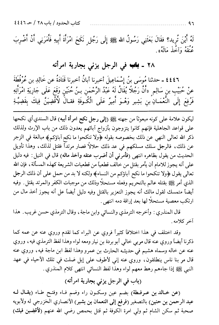 [4458] (عَنْ خَالِدِ بْنِ عُرْفُطَةَ) بِضَمِّ عَيْنٍ وَسُكُونِ رَاءٍ وَضَمِّ فَاءٍ وَفَتْحِ طَاءٍ (يُقَالُ لَهُ عَبْدُ الرَّحْمَنِ بْنُ حُنَيْنٍ) بِالتَّصْغِيرِ (فَرُفِعَ إِلَى النُّعْمَانِ بْنِ بَشِيرٍ) الْأَنْصَارِيِّ الْخَزْرَجِيِّ لَهُ وَلِأَبَوَيْهِ صُحْبَةٌ ثُمَّ سَكَنَ الشَّامَ ثُمَّ وَلِيَ إِمْرَةَ الْكُوفَةِ ثُمَّ قُتِلَ بِحِمْصٍ رَضِيَ اللَّهُ عَنْهُمْ (لَأَقْضِيَنَّ فِيكَ) الْخِطَابُ