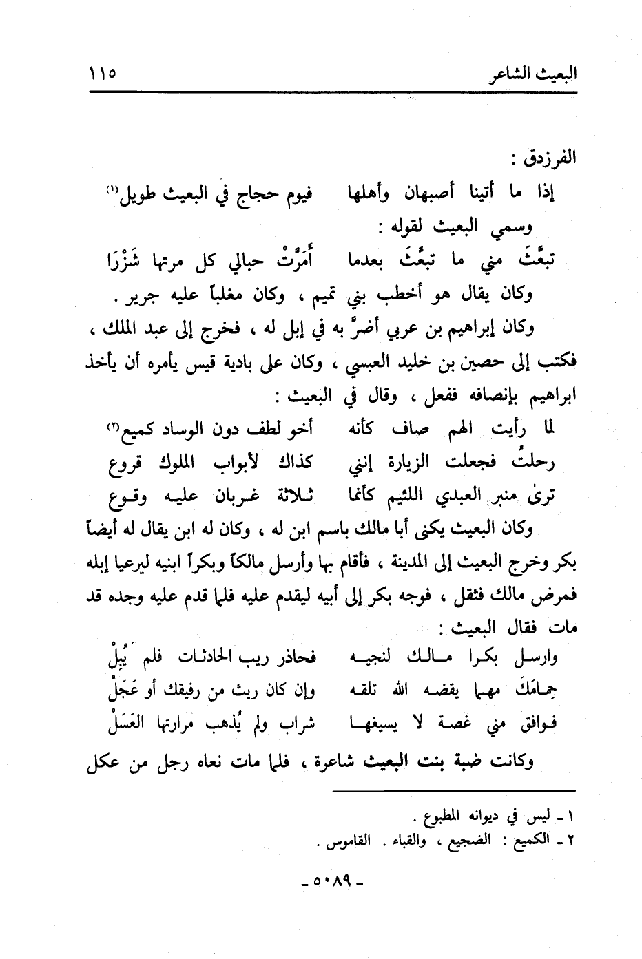 وكان إِبْرَاهِيم بْن عربي أضرَّ به فِي إبل له، فخرج إِلَى عَبْد الملك، فكتب إِلَى حصين بْن خليد العبسي، وَكَانَ عَلَى بادية قَيْس يأمره أن يأخذ إِبْرَاهِيم بإنصافه ففعل، وقال في البعيث: