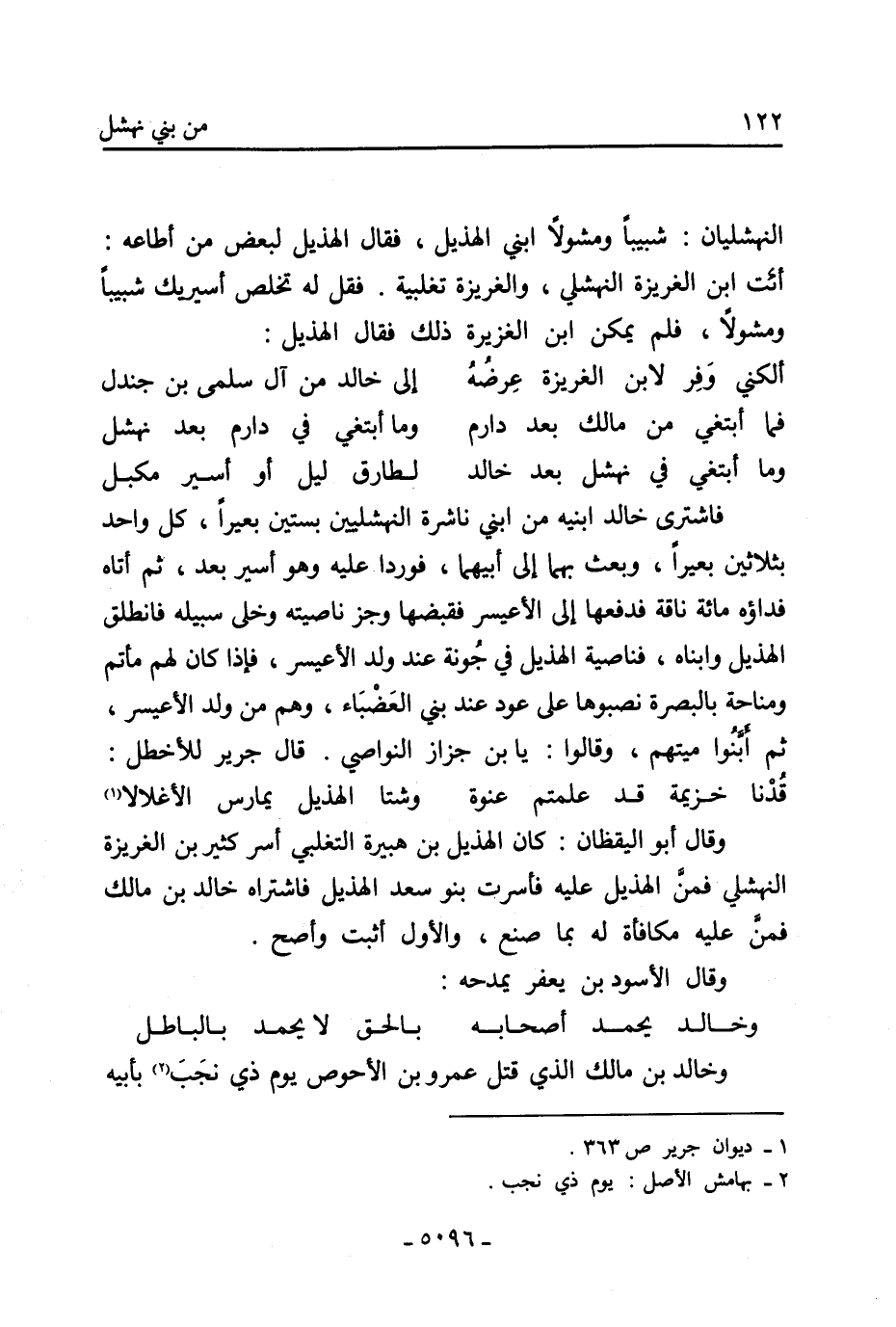 وقال أَبُو اليقظان: كان الهذيل بْن هبيرة التغلبي أسر كثير بْن الغريزة النهشلي فمنَّ الهذيل عليه فأسرت بنو سعد الهذيل فاشتراه خَالِد بْن مالك فمنَّ عليه مكافأة له بما صنع، والأول أثبت وأصح.