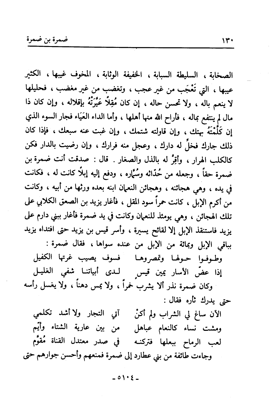 الصخابة، السليطة السبابة، الخفيفة الوثابة، المخوف غيبها، الكثير عيبها، التي تَعْجَب من غير عجب، وتغضب من غير مغضب، فحليلها لا ينعم باله، ولا تحسن حاله، إن كان مُقِلًا عَيَّرَتْهُ بإقلاله، وإن كان ذا مال لم ينتفع بماله، فأراح اللَّه منها أهلها، وأما الداء العَيَاء فجار السوء الَّذِي إن كَلَّمْتَهُ بهتك، وإن قاولته شتمك، وإن غبت عَنْهُ سبعك، فإذا كان ذلك جارك فخلِّ له دارك، وعجل منه فرارك، وإن رضيت بالدار فكن كالكلب الهرار، وأقِرَّ له بالذل والصغار. قال: صدقت أنت ضمرة بْن ضمرة حقا، وجعله من حُدّاثه وسُمَّاره، ودفع إليه إبلًا كَانَتْ له، فكانت فِي يده، وهي هجائنه، وهجائن النعمان ابنه بعده ورثها من أَبِيهِ، وكانت من أكرم الإبل، كَانَتْ حمرًا سود المقل، فأغار يزيد بْن الصعق الكلابي على تلك الهجائن، وهي يومئذ للنعمان وكانت فِي يد ضمرة فأغار ببني دارم على يزيد فاستنقذ الإبل إلا لقائح يسيرة، وأسر قَيْس بْن يزيد حَتَّى افتداه يزيد بباقي الإبل وبمائة من الإبل من عنده سواها، فقال ضمرة: