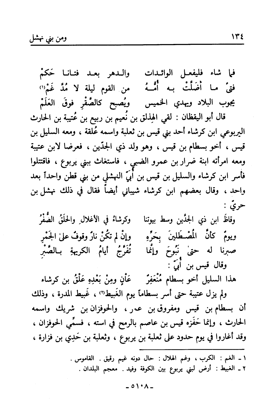 قال أَبُو اليقظان: لقي الهِذلق بْن نُعيم بْن ربيع بْن عُتيبة بْن الْحَارِث اليربوعي ابن كرشاء أحد بني قَيْس بْن ثَعْلَبَة واسمه عُلقة، ومعه السليل بْن قَيْس، أخو بسطام بْن قَيْس، وهو ولد ذي الجدّين، فعرضا لابن عتيبة ومعه امرأته ابْنَة ضرار بْن عمرو الضَّبِّيّ، فاستغاث ببني يربوع، فاقتتلوا فأسر ابن كرشاء والسليل بْن قَيْس بْن أُبي النهشلي من بني قطن واحدًا بعد واحد، وقال بعضهم ابن كرشاء شيباني أيضًا فقال فِي ذلك نهشل بْن حري: