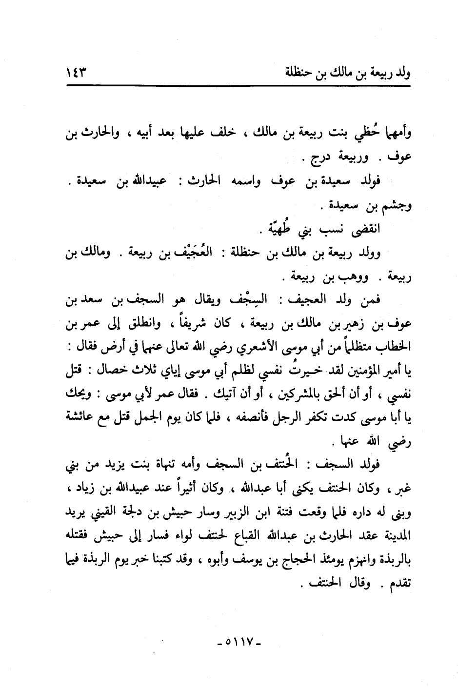 فولد السجف: الحُنتف بْن السجف وأمه تنهاة بِنْت يزيد من بني غبر، وكان الحنتف يكنى أَبَا عَبْد اللَّه، وكان أثيرًا عند عبيد اللَّه بْن زياد، وبنى له داره فَلَمَّا وقعت فتنة ابن الزبير وسار حبيش بْن دلجة القيني يريد المدينة عقد الْحَارِث بْن عَبْد اللَّه القباع لحنتف لواء فسار إِلَى حبيش فقتله بالربذة وانهزم يومئذ الحجاج بْن يوسف وأبوه، وقد كتبنا خبر يوم الربذة فيما تقدم. وقال الحنتف.