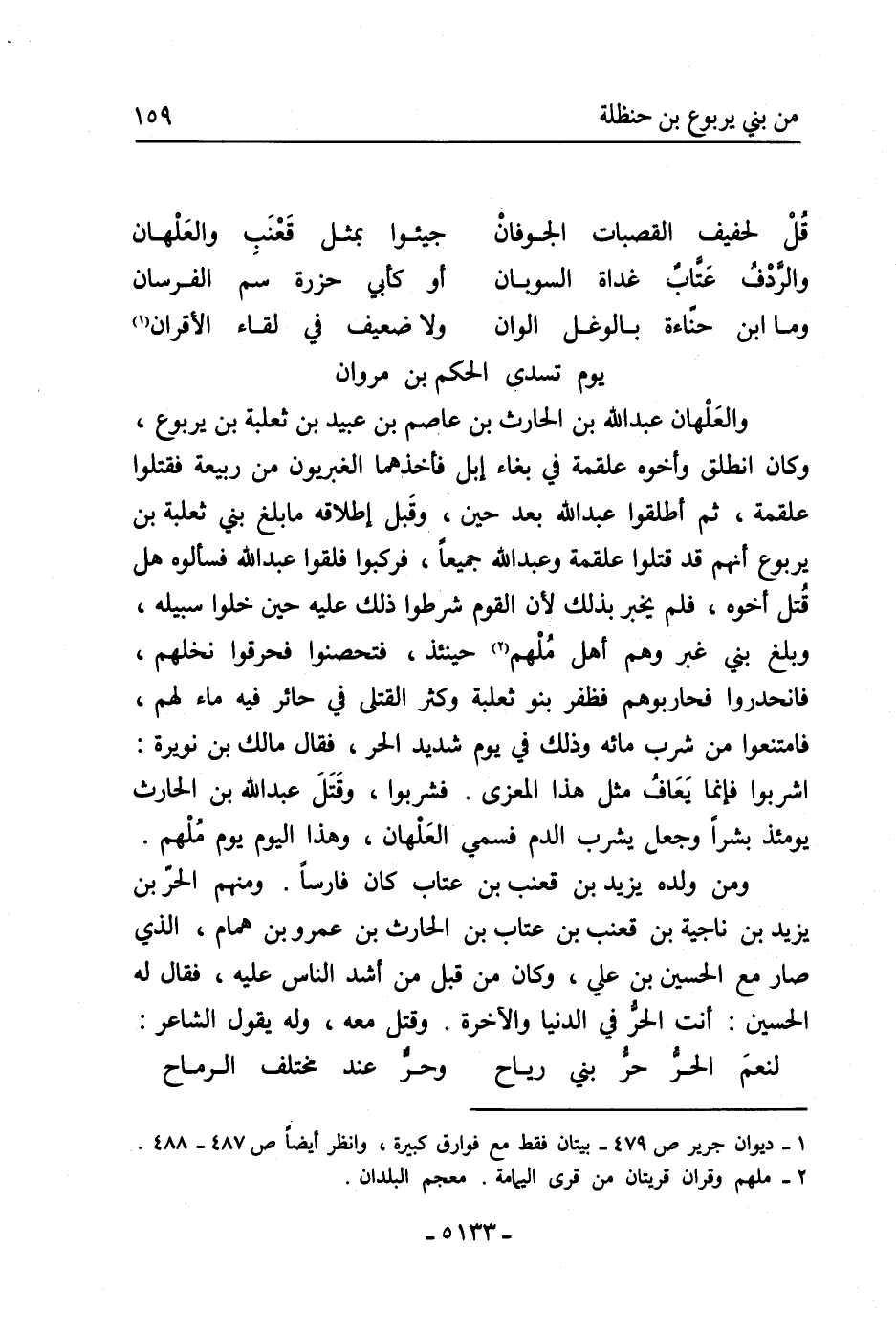 والعَلْهان عَبْد اللَّه بْن الْحَارِث بْن عَاصِم بْن عُبَيْد بْن ثَعْلَبَة بْن يربوع، وكان انطلق وأخوه علقمة فِي بغاء إبل فأخذهما الغبريون من ربيعة فقتلوا علقمة، ثُمَّ أطلقوا عَبْد اللَّه بعدْ حين، وقَبل إطلاقه ما بلغ بني ثَعْلَبَة بْن يربوع أنهم قد قتلوا علقمة وعبد اللَّه جميعًا، فركبوا فلقوا عَبْد اللَّه فسألوه هَلْ قُتل أخوه، فلم يخبر بِذَلِك لأن القوم شرطوا ذلك عليه حين خلوا سبيله، وبلغ بني غبر وهم أَهْل مُلْهم [2] حينئذ، فتحصنوا فحرقوا نخلهم، فانحدروا فحاربوهم فظفر بنو ثَعْلَبَة وكثر القتلى فِي حائر فِيهِ ماء لهم، فامتنعوا من شرب مائه وذلك فِي يوم شديد الحر، فقال مالك بْن نويرة: