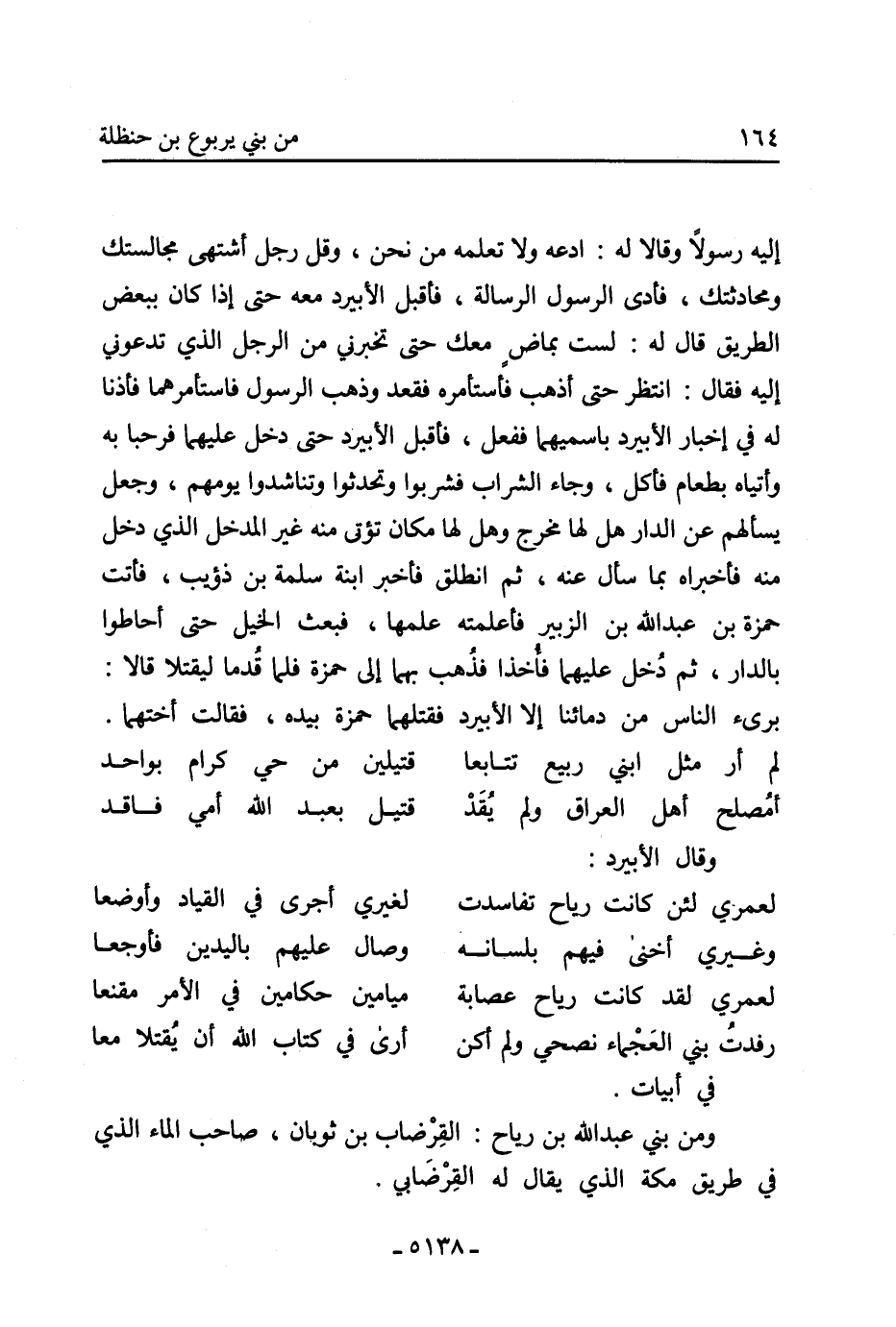 إليه رسولا وقالا له: ادعه ولا تعلمه من نَحْنُ، وقل رَجُل أشتهي مجالستك ومحادثتك، فأدى الرَّسُول الرسالة، فَأَقْبَلَ الأبيرد معه حَتَّى إذا كان ببعض الطريق قال له: لست بماضٍ معك حَتَّى تخبرني من الرجل الَّذِي تدعوني إليه فقال: انتظر حَتَّى أذهب فأستأمره فقعد وذهب الرَّسُول فاستأمرهما فأذنا له فِي إخبار الأبيرد باسميهما ففعل، فَأَقْبَلَ الأبيرد حَتَّى دخل عليهما فرحبا به وأتياه بطعام فأكل، وجاء الشراب فشربوا وتحدثوا وتناشدوا يومهم، وجعل يسألهم عن الدار هَلْ لها مخرج وهل لها مكان تؤتى منه غير المدخل الَّذِي دخل منه فأخبراه بما سَأَلَ عَنْهُ، ثُمَّ انطلق فأخبر ابْنَة سلمة بْن ذؤيب، فأتت حَمْزَة بْن عَبْد اللَّه بْن الزبير فأعلمته علمها، فبعث الخيل حَتَّى أحاطوا بالدار، ثُمَّ دُخل عليهما فأخذا فذُهب بهما إِلَى حَمْزَة فَلَمَّا قُدما ليقتلا قَالا: