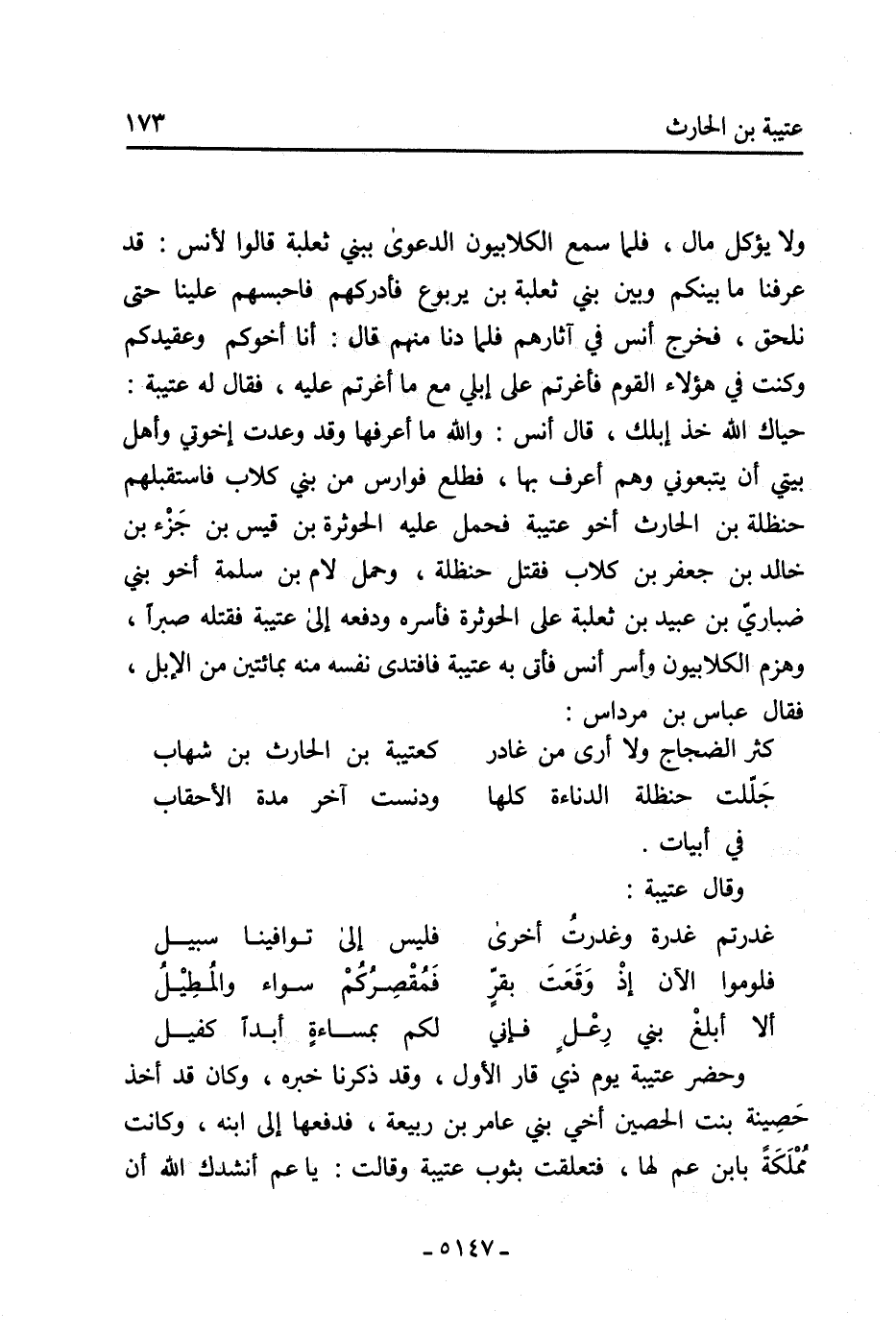 حياك اللَّه خذ إبلك، قال أَنَس: والله ما أعرفها وقد وعدت إخوتي وأهل بيتي أن يتبعوني وهم أعرف بها، فطلع فوارس من بني كلاب فاستقبلهم حنظلة بْن الْحَارِث أخو عتيبة فحمل عليه الحوثرة بْن قَيْس بْن جَزْء بْن خَالِد بْن جَعْفَر بْن كلاب فقتل حنظلة، وحمل لام بْن سلمة أخو بني ضباري بْن عُبَيْد بْن ثَعْلَبَة على الحوثرة فأسره ودفعه إِلَى عتيبة فقتله صبرًا، وهزم الكلابيون وأسر أَنَس فأتى به عتيبة فافتدى نفسه منه بمائتين من الإبل، فقال عَبَّاس بْن مرداس: