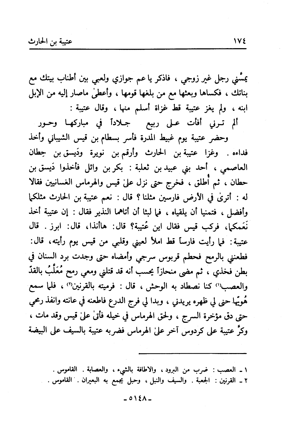 فطعنني بالرمح فحطم قربوس سرجي وأمضاه حَتَّى وجدت برد السنان فِي بطن فخذي، ثُمَّ مضى منحازًا يحسب أنه قد قتلني ومعي رمح مُعَلَّبُ بالقد والعصب [1] كُنَّا نصطاد به الوحش، قال: فرميته بالقرنين [2] ، فَلَمَّا سمع هُويّها حنى لي ظهره يريدني، وبدا لي فرج الدرع فاطعنه فِي عانته وأنفذ رمحي حَتَّى دق مؤخرة السرج، ولحق الهرماس فِي خيله فأتى على قَيْس وقد مات، وكرَّ عتيبة على كردوس آخر على الهرماس فضربه عتيبة بالسيف على البيضة