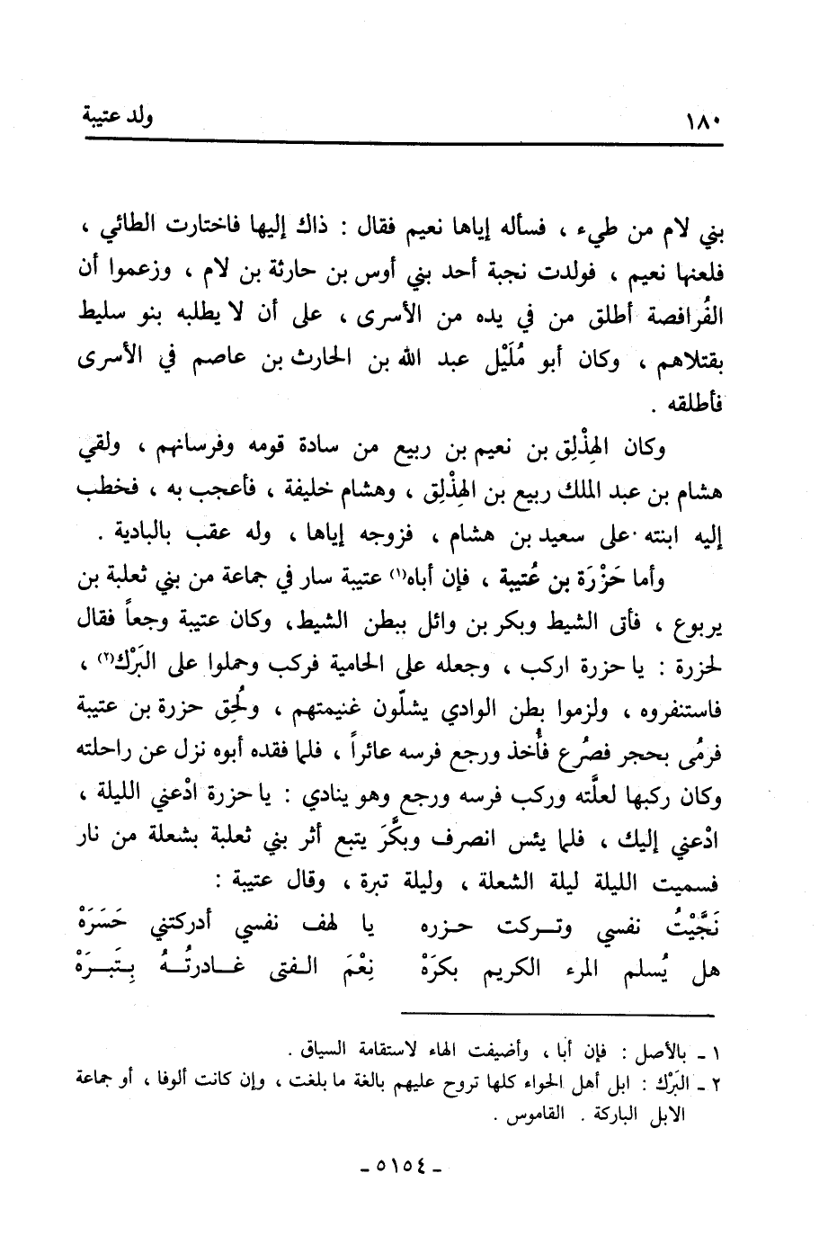 فَإِن أباه [1] عتيبة سار فِي جماعة من بني ثَعْلَبَة بْن يربوع، فأتى الشيط وبكر بْن وائل ببطن الشيط، وكان عتيبة وجعًا فقال لحزرة: يا حزرة اركب، وجعله على الحامية فركب وحملوا على البَرْك [2] ، فاستنفروه، ولزموا بطن الوادي يشلّون غنيمتهم، ولُحِق حزرة بْن عتيبة فرمى بحجر فصُرع فأُخذ ورجع فرسه عائرًا، فَلَمَّا فقده أَبُوهُ نزل عن راحلته وكان ركبها لعلَّته وركب فرسه ورجع وهو ينادي: يا حزرة ادْعني الليلة، ادْعني إليك، فَلَمَّا يئس انصرف وبكَّرَ يتبع أثر بني ثَعْلَبَة بشعلة من نار فسميت الليلة ليلة الشعلة، وليلة تبرة، وقال عتيبة: