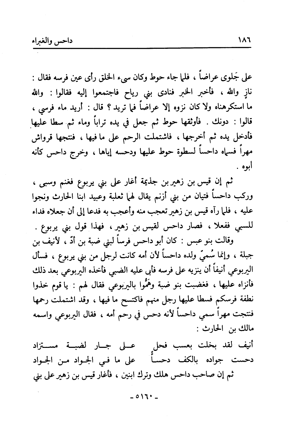 نازٍ والله، فأخبر الخبر فنادى بني رياح فاجتمعوا إليه فقالوا: والله ما استكرهناه ولا كان نزوه إلا عراضًا فَمَا تريد؟ قال: أريد ماء فرسي، قَالُوا: دونك. فأوثقها حوط ثُمَّ جعل فِي يده ترابًا وماء ثُمَّ سطا عليها فأدخل يده ثُمَّ أخرجها، فاشتملت الرحم على ما فيها، فنتجها قرواش مهرًا فسماه داحسًا لسطوة حوط عليها ودحسه إياها، وخرج داحس كأنه أَبُوهُ.