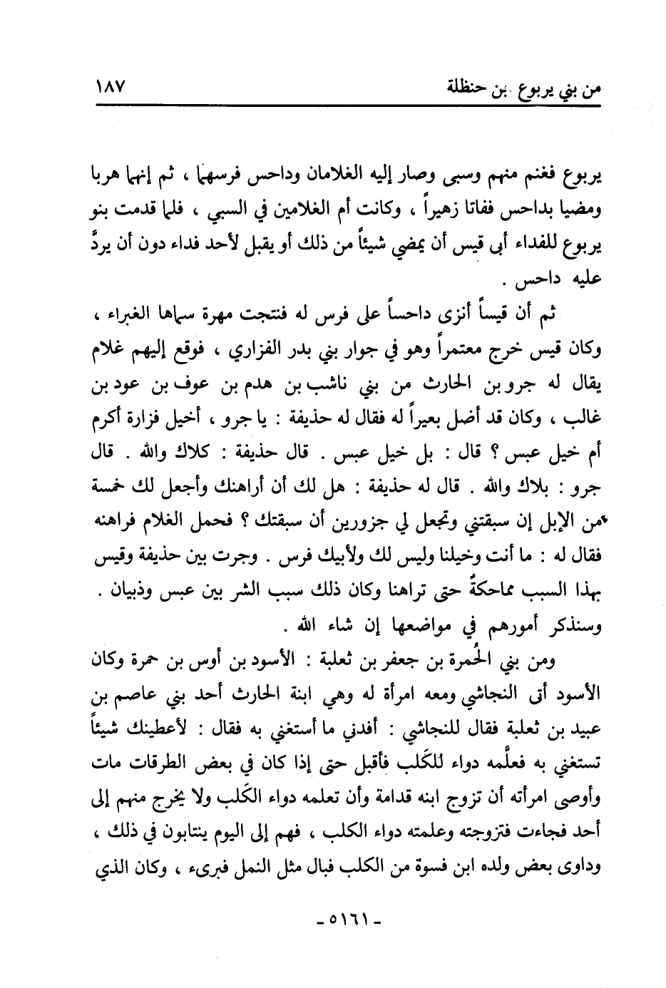 يربوع فغنم منهم وسبى وصار إليه الغلامان وداحس فرسهما، ثُمَّ إنهما هربا ومضيا بداحس ففاتا زهيرًا، وكانت أم الغلامين فِي السبي، فَلَمَّا قدمت بنو يربوع للفداء أَبِي قَيْس أن يمضي شيئًا من ذلك أو يقبل لأحد فداء دون أن يردَّ عليه داحس.