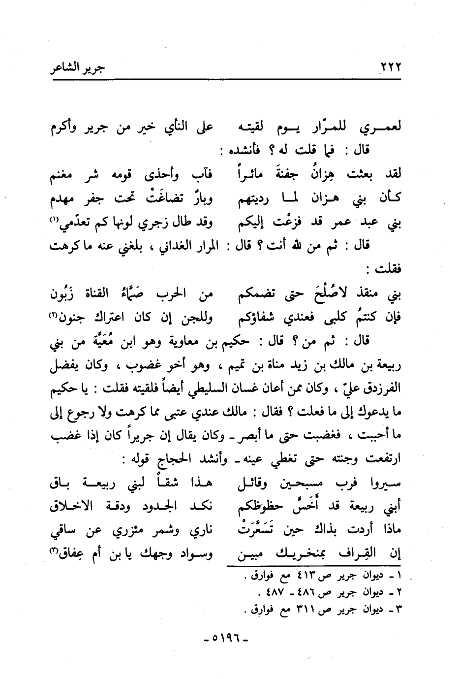 قال: ثُمَّ من؟ قال: حكيم بْن مُعَاوِيَة وهو ابن معيّة من بني رَبِيعَة بْن مَالِك بْن زَيْد مناة بْن تميم، وهو أخو غضوب، وكان يفضل الفرزدق علي، وكان مِمَّنْ أعان غسان السليطي أيضًا فلقيته فقلت: يا حكيم ما يدعوك إِلَى ما فعلت؟ فقال: مالك عندي عتبي مما كرهت ولا رجوع إِلَى ما أحببت، فغضبت حَتَّى ما أبصر- وكان يُقَالُ إن جريرا كان إذا غضب ارتفعت وجنته حَتَّى تغطي عينه- وأنشد الحجاج قوله: