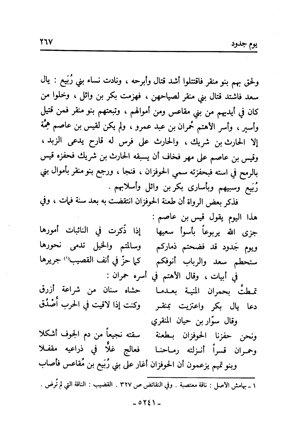 فذكر بعض الرواة أن طعنة الحوفزان انتقضت به بعد سنة فمات، وَفِي هَذَا اليوم يقول قَيْس بْن عاصم: