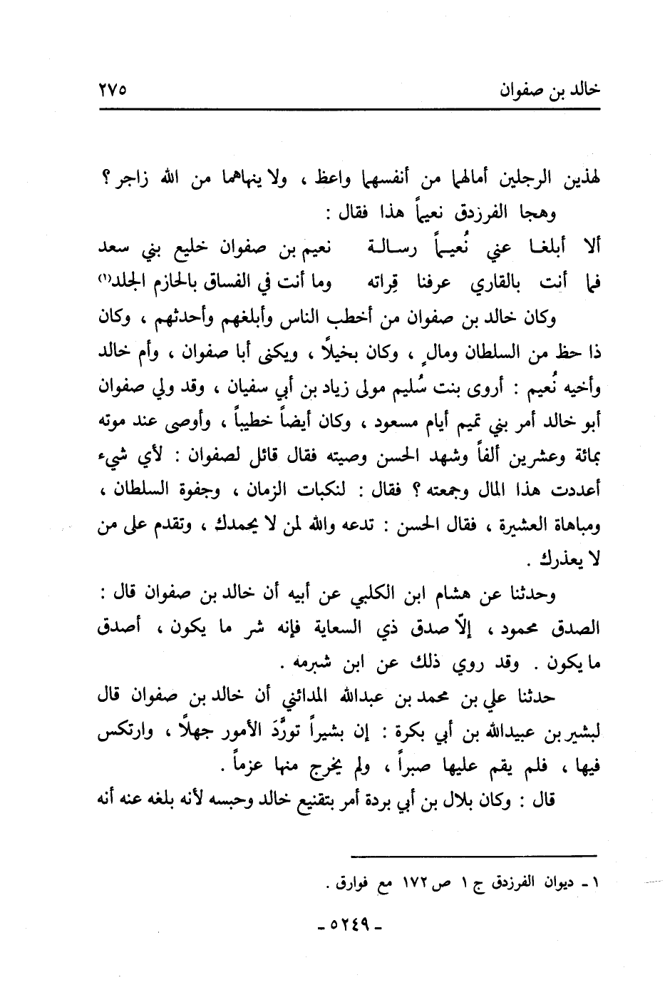 حَدَّثَنَا عَلي بْن مُحَمَّد بْن عَبْد اللَّه المدائني أن خَالِد بْن صفوان قال لبشير بْنِ عُبَيْدِ اللَّهِ بْنِ أَبِي بَكْرةَ: أَنَّ بشيرًا تورَّدَ الأمور جهلًا، وارتكس فيها، فلم يقم عليها صبرًا، ولم يخرج منها عزمًا.